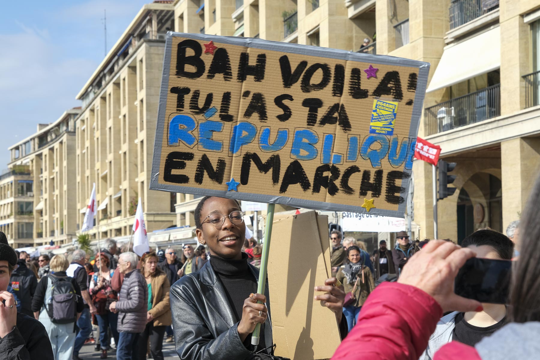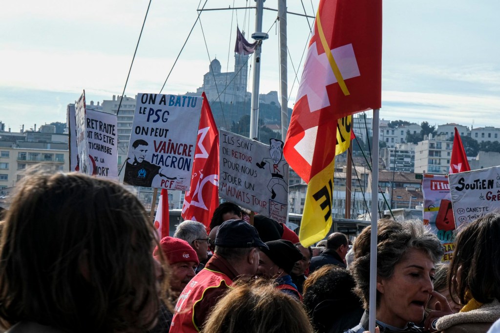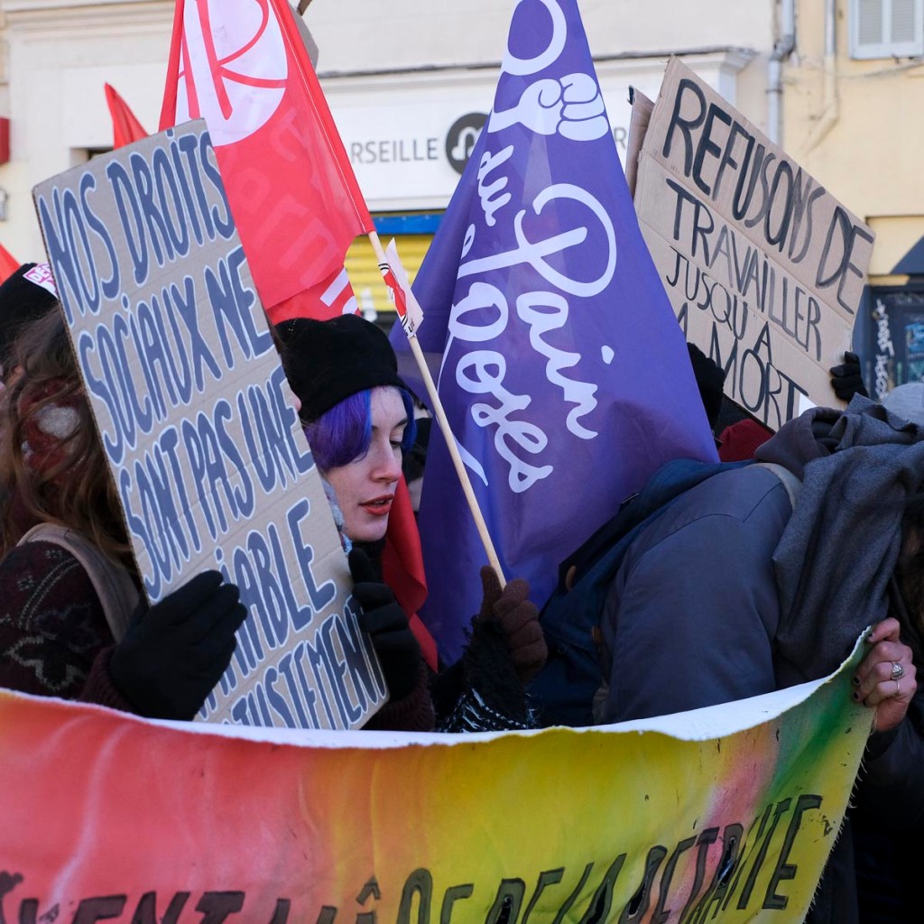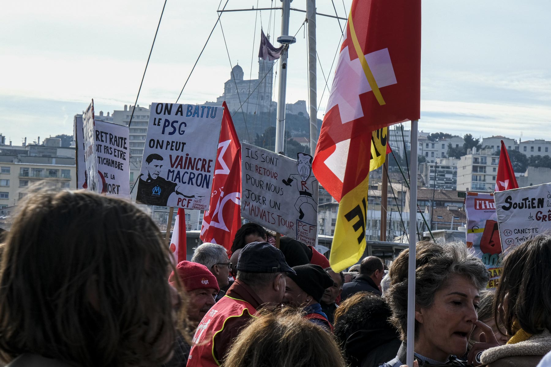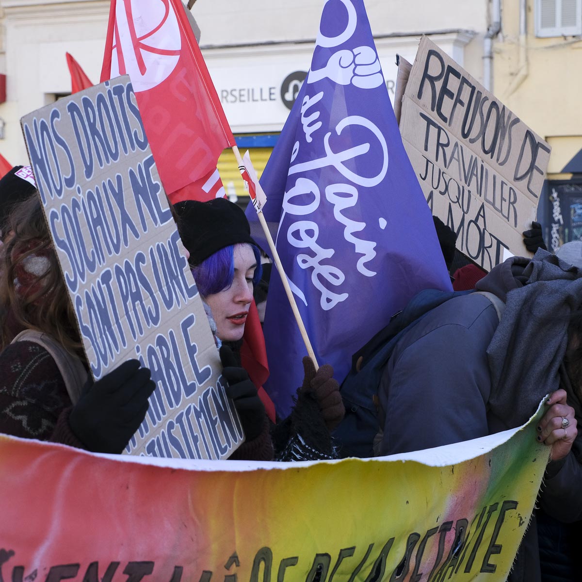 Départ aux Réformés vers 10 h. La manifestation s’ébroue lentement, très lentement, il y a beaucoup de monde. Arrivé sur la passerelle qui enjambe le cours Lieutaud, impossible de trouver une place pour faire des images en surplomb. Je continue en direction de Castellanne avant de faire demi-tour et de remonter toute la manifestation, appareil à la main, jusqu’à son points de départ : je fais cette image alors que les derniers manifestants sont sur le point de démarrer, Il est un peu plus de midi.