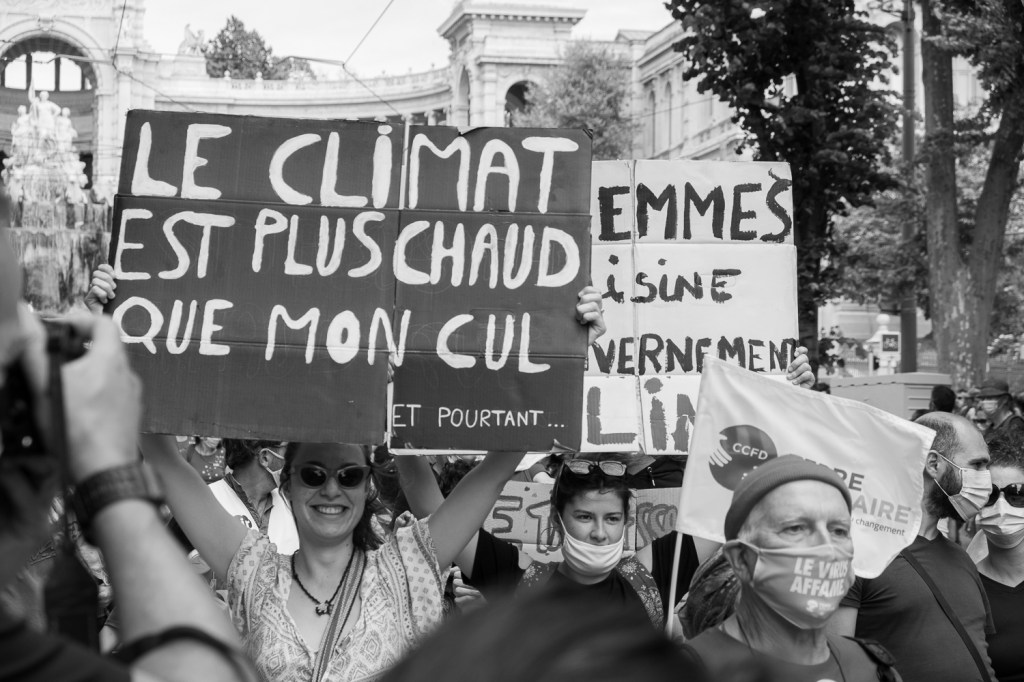 Ainsi cette image de la marche pour le climat du 9 mai 2021. Je la retiens parce que je la trouve drôle à deux titres : le slogan humoristique typiquement local et le visage très sérieux de la dame portant la pancarte.