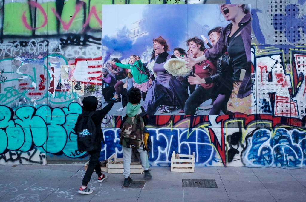 Mardi 8 mars, je me rends à la Plaine pour découvrir la belle photographie couleur de ma copine Anne. Quelques jours plus tôt, elle me dit : « Je vais la faire tirer en grand format et je la collerais en plusieurs exemplaires sur la place. » J’arrive tard, il est presque 19 h, la nuit tombe quand je me pose devant la photo en même temps que deux écoliers du quartier :
