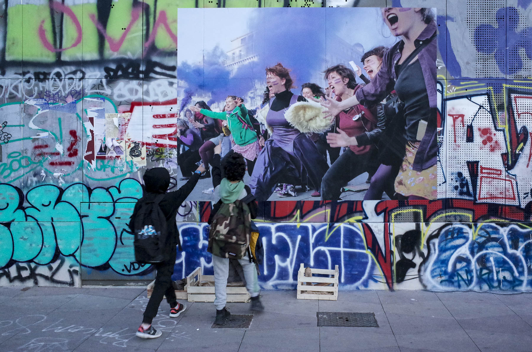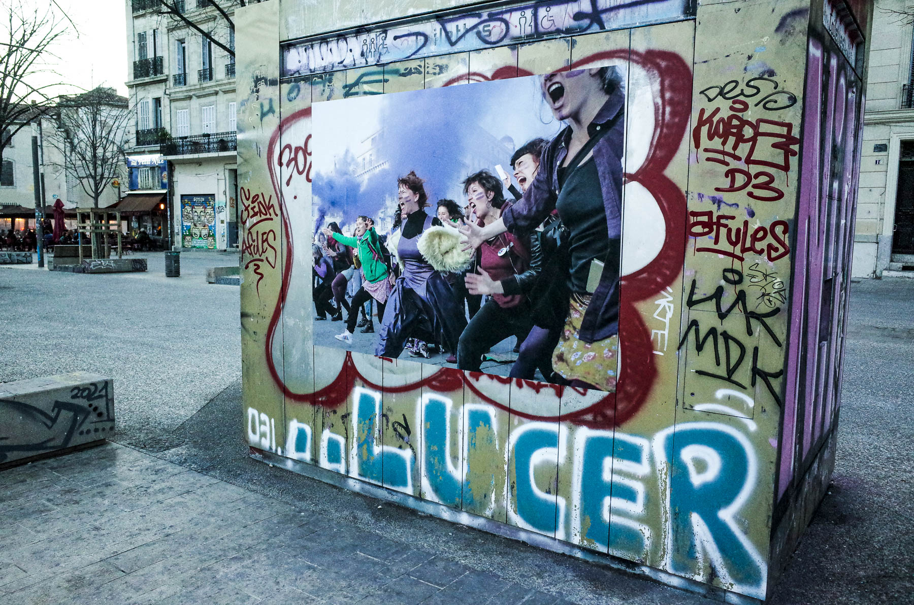 Mardi 8 mars, je me rends à la Plaine pour découvrir la belle photographie couleur de ma copine Anne. Quelques jours plus tôt, elle me dit : « Je vais la faire tirer en grand format et je la collerais en plusieurs exemplaires sur la place. » J’arrive tard, il est presque 19 h, la nuit tombe quand je me pose devant la photo en même temps que deux écoliers du quartier :