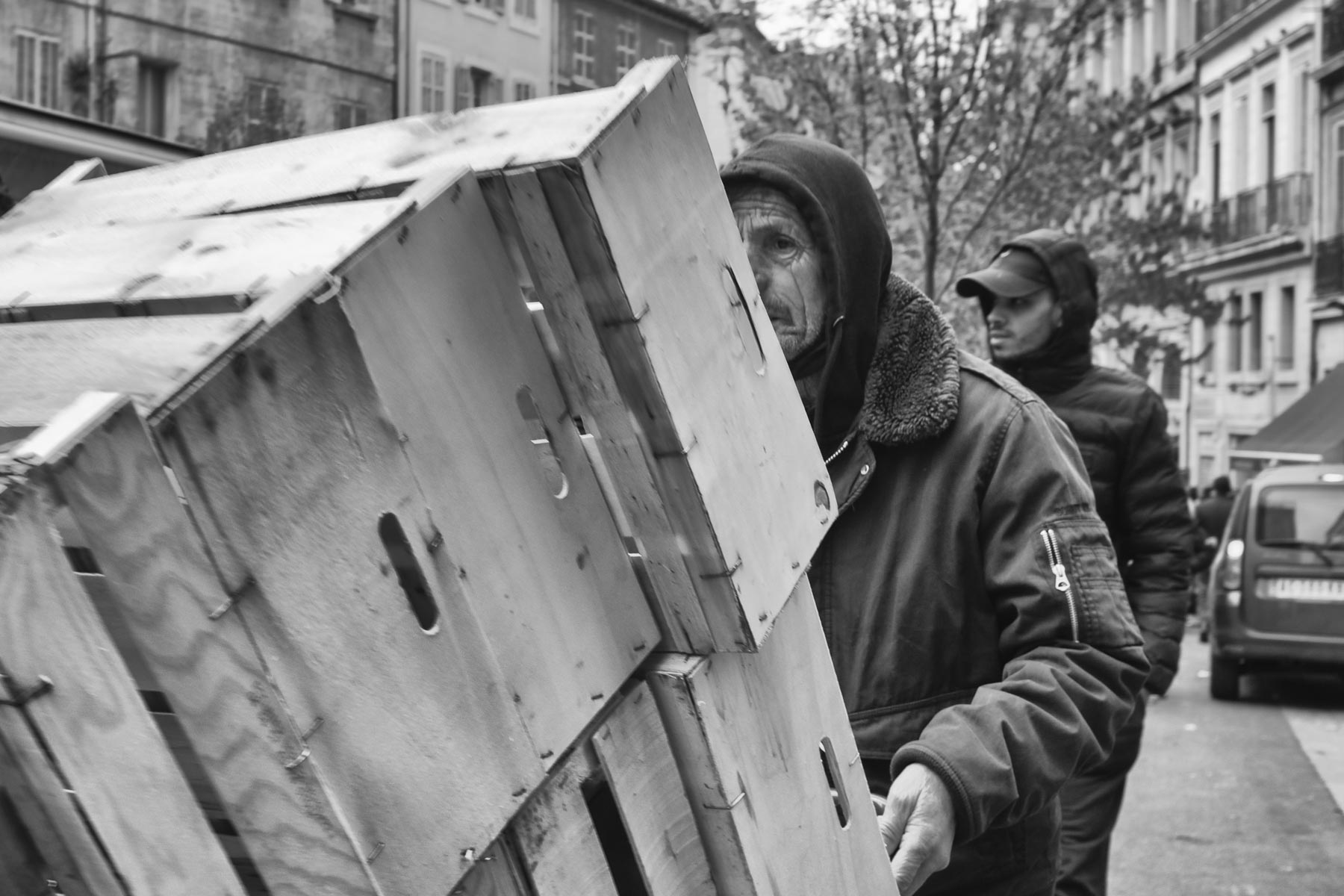 Un marché toujours très animé. Des commerces le long de la rue, des maraîchers au milieu de la place et des employés qui s’activent au rangement et à l’approvisionnement des étals.
