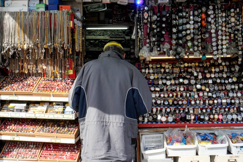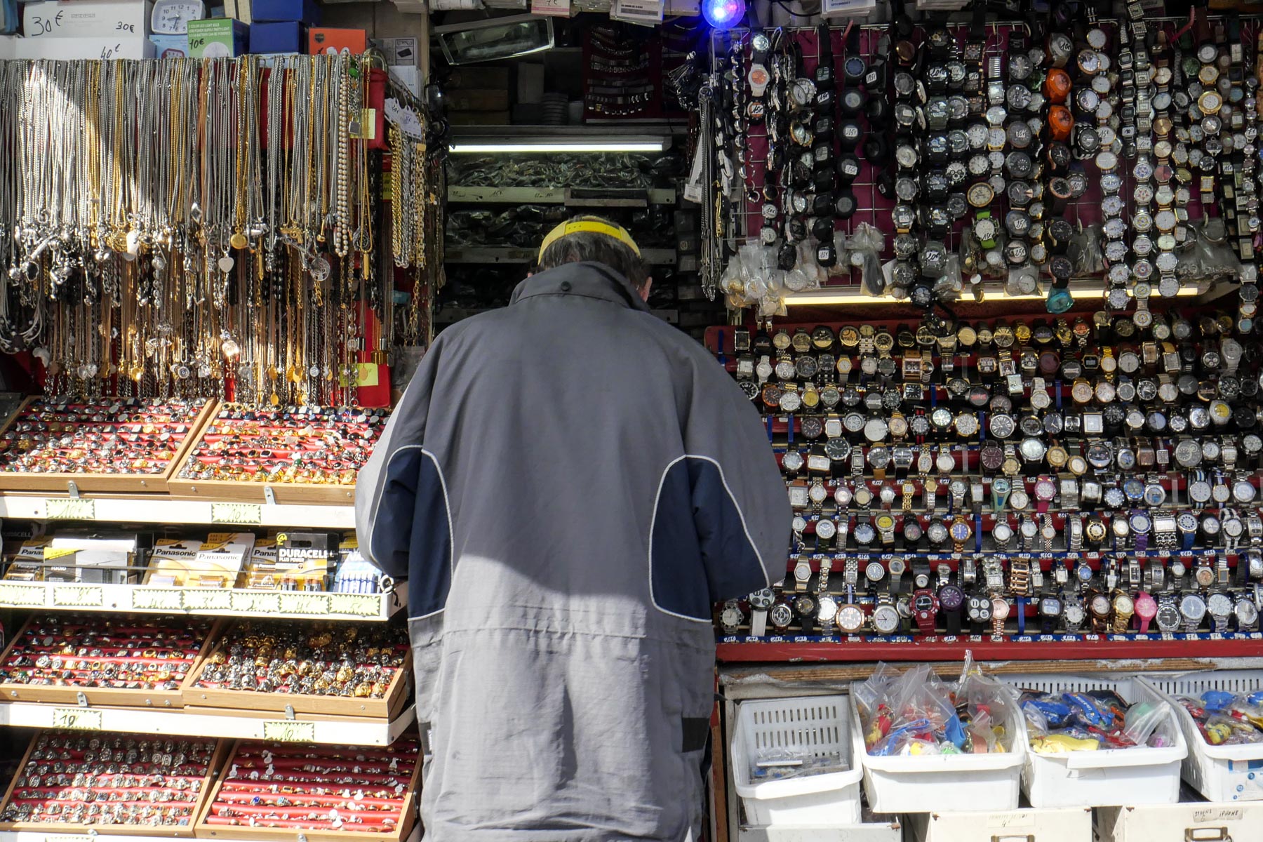 En face de l’église des Réformés, plusieurs commerces dont cette boutique qui m’impressionne à chaque fois par la densité des articles en exposition. Et un client au milieu des marchandises, un !