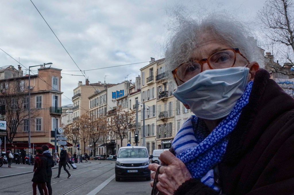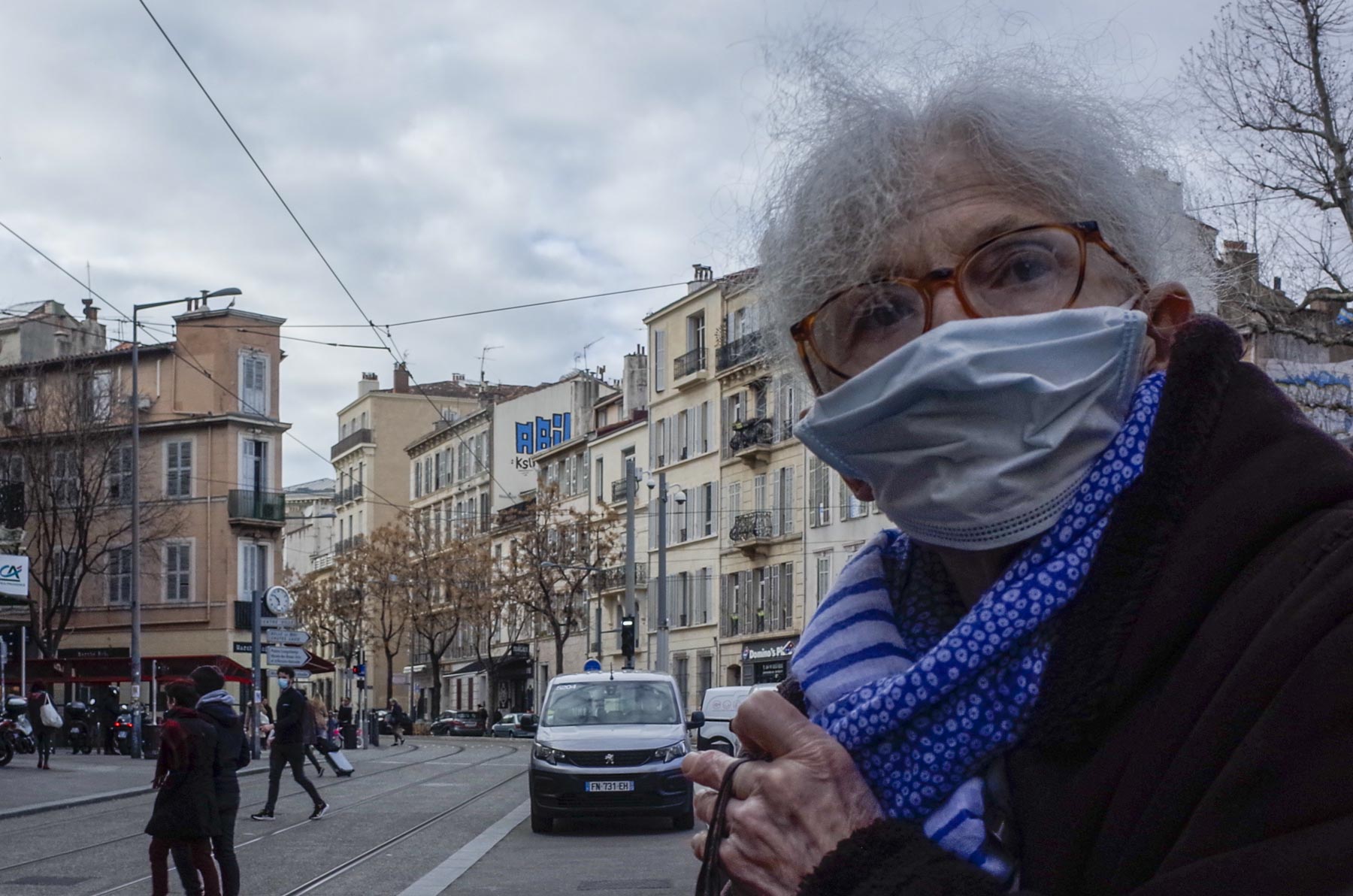 A l’arrêt de tram. Je patiente, appareil à la main, et j’attends que la dame se tourne vers moi.
