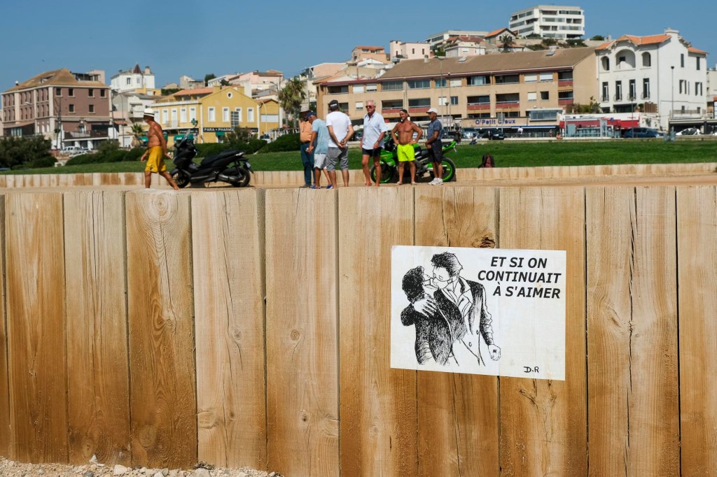 Je passe à pied (ou à vélo, je ne me souviens plus), le long de la palissade entre le terrain de boules (joueurs au second plan) et la mer. Les boulistes ont-ils vu cette affiche ? Je ne leur ai pas demandé, je rentre vite chez moi…