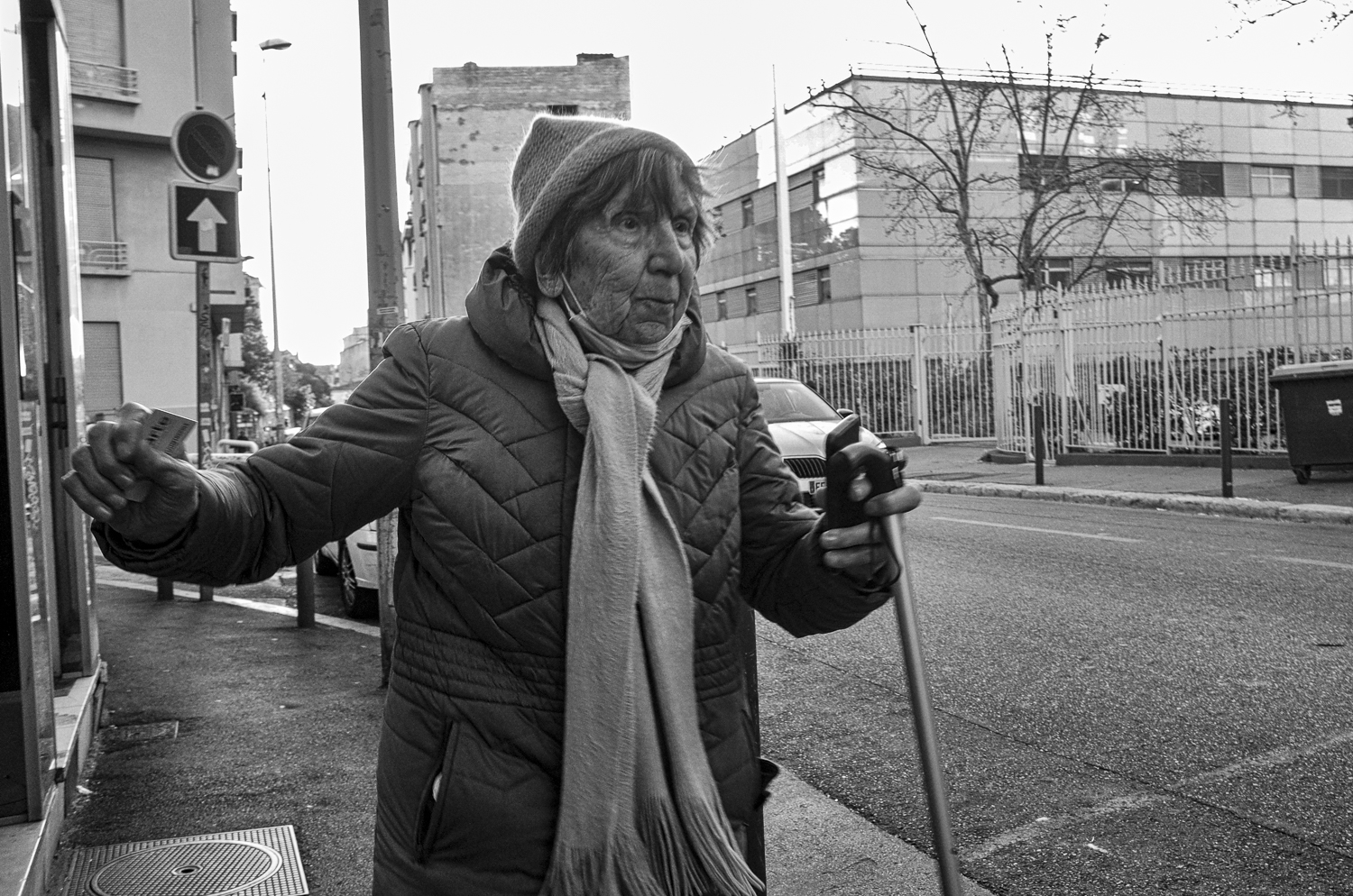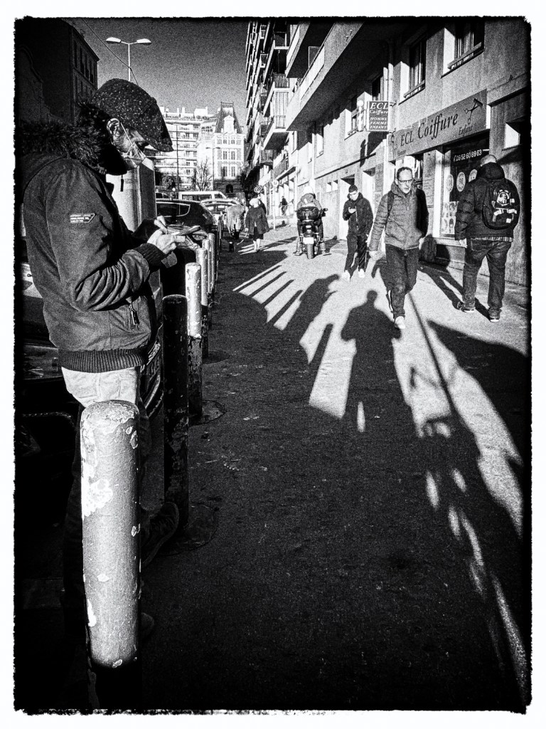 Je fais la queue dans la rue devant la pharmacie. Comme tout le monde… Je n’ai pas mon appareil photo, j’en profite pour tester l’objectif grand angle de mon téléphone portable et ajouter quelques effets sur la photo.