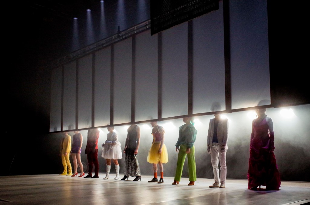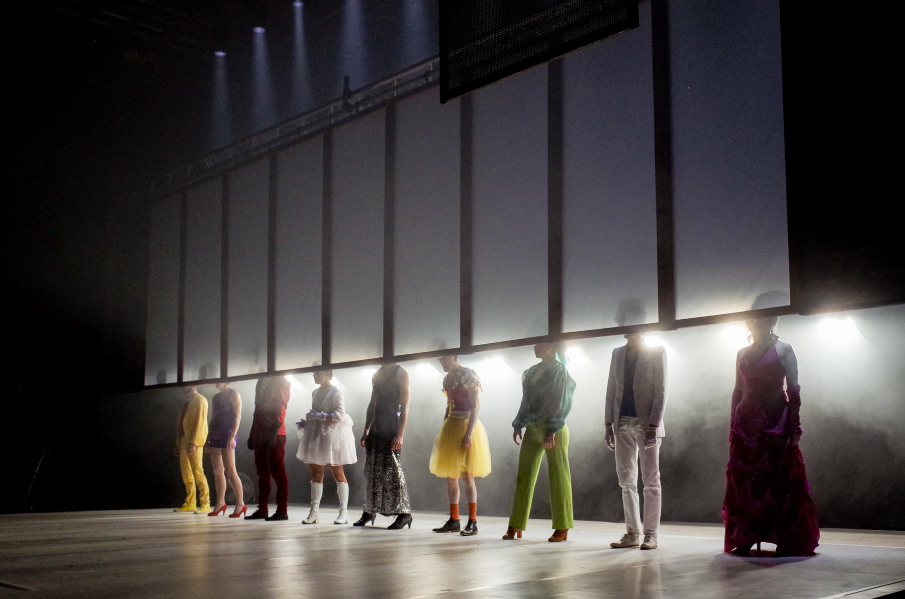 « Dans un espace étrange qui pourrait être un songe, une zone de transit, un salon cosmopolite ou un plateau de cinéma, semble convoquée une assemblée d’êtres en errance, apparaissant à l’appel d’un roi frappé d’amnésie, père déchu d’une lignée saisie par le doute d’exister, fol époux au cœur d’une famille mal recomposée. Les Mariés de l’Apocalypse révèle la souillure d’une génération incestueuse », écrit Marion Coutris, l’auteur des textes de cet opéra théâtre, dans le fascicule de présentation.