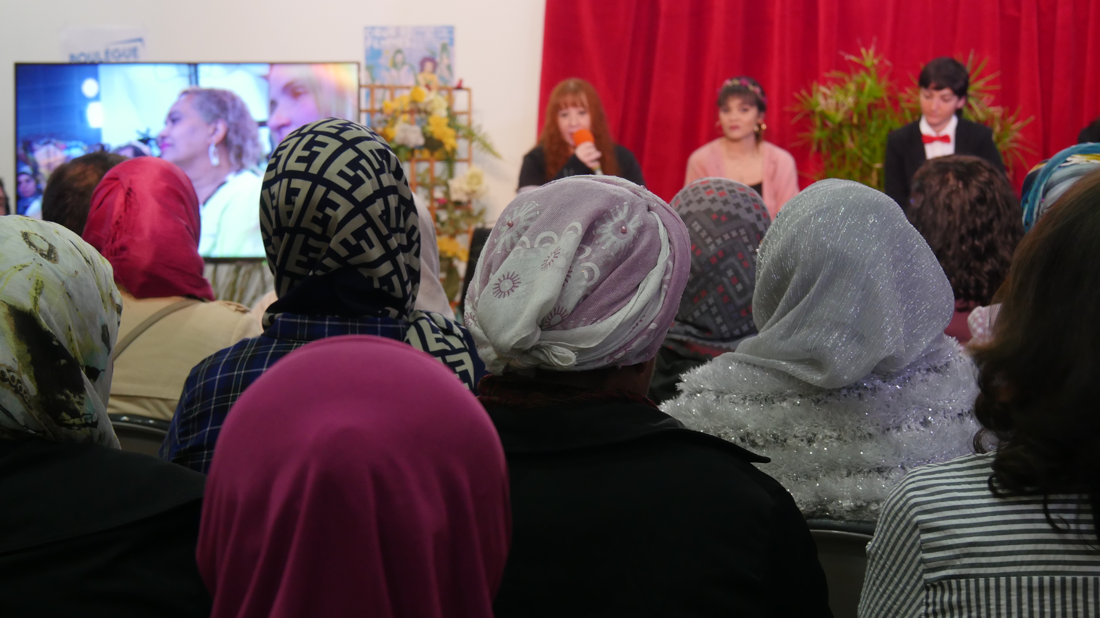 Dans le cadre de la journée des droits des femmes, l’Espace Velten accueille un plateau télévision participatif, mis en place par Boulègue TV, un média de proximité du troisième arrondissement de Marseille. La femme rousse qui parle dans le micro dévoile son passé de sans-abri devant un public très attentif.