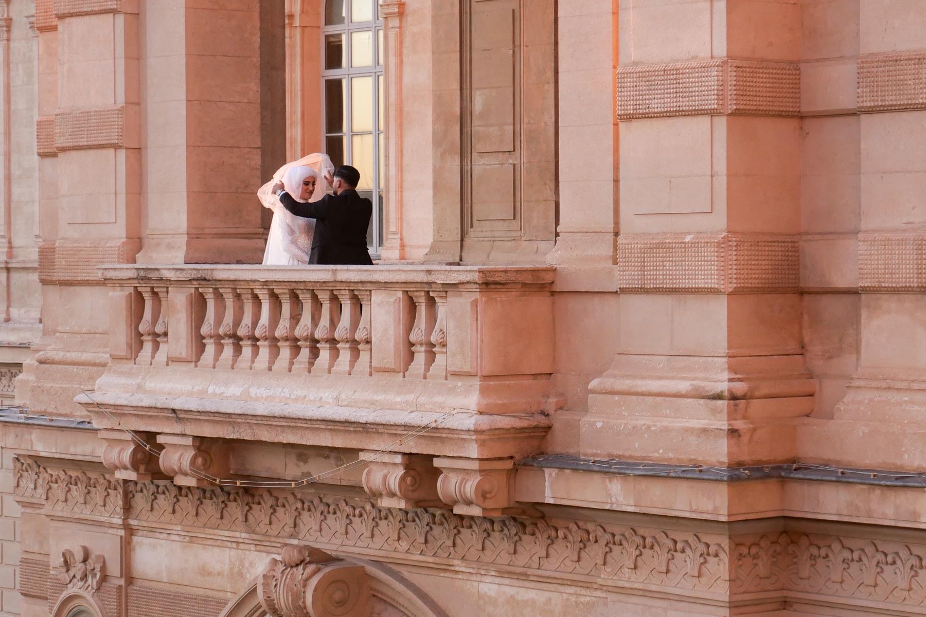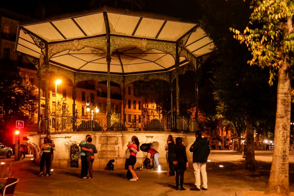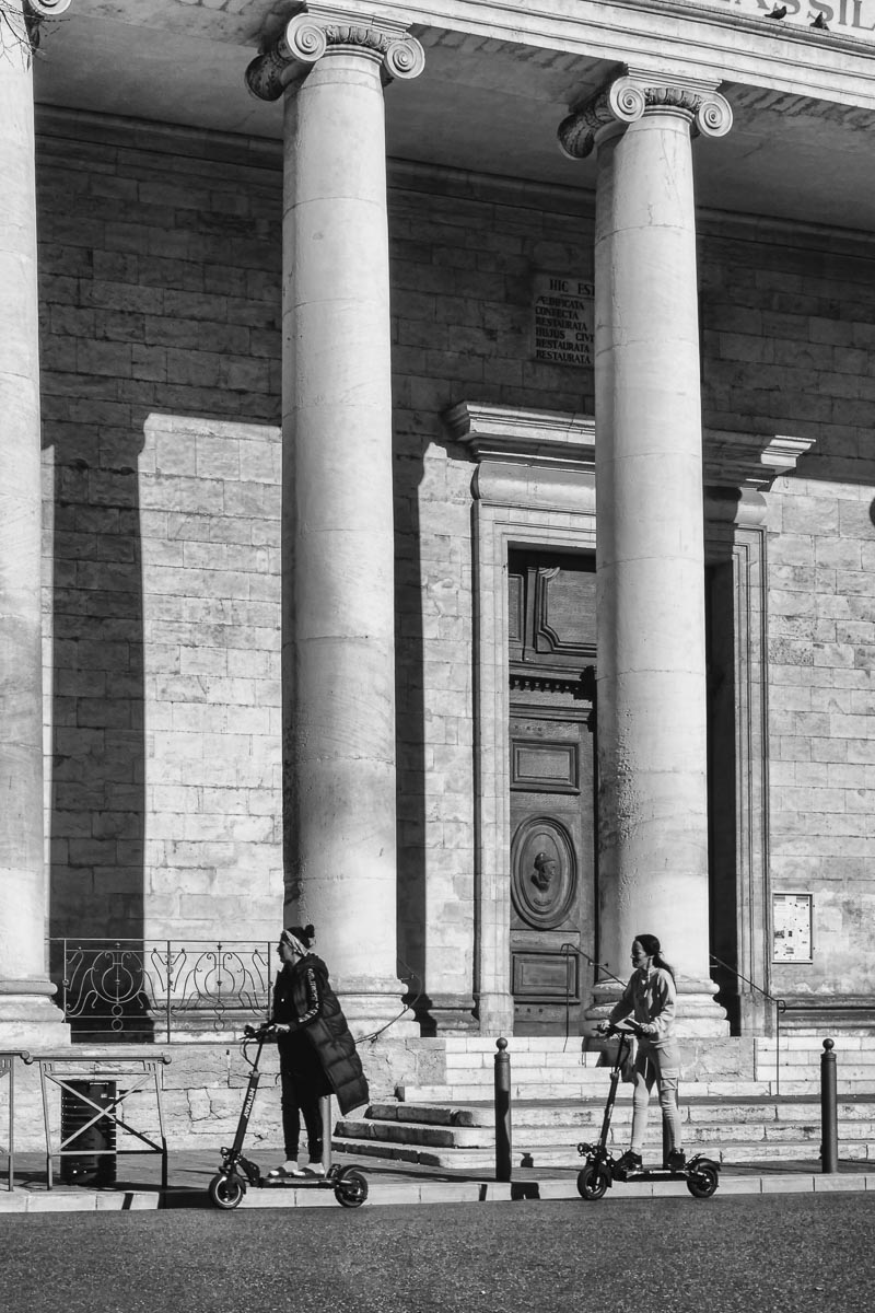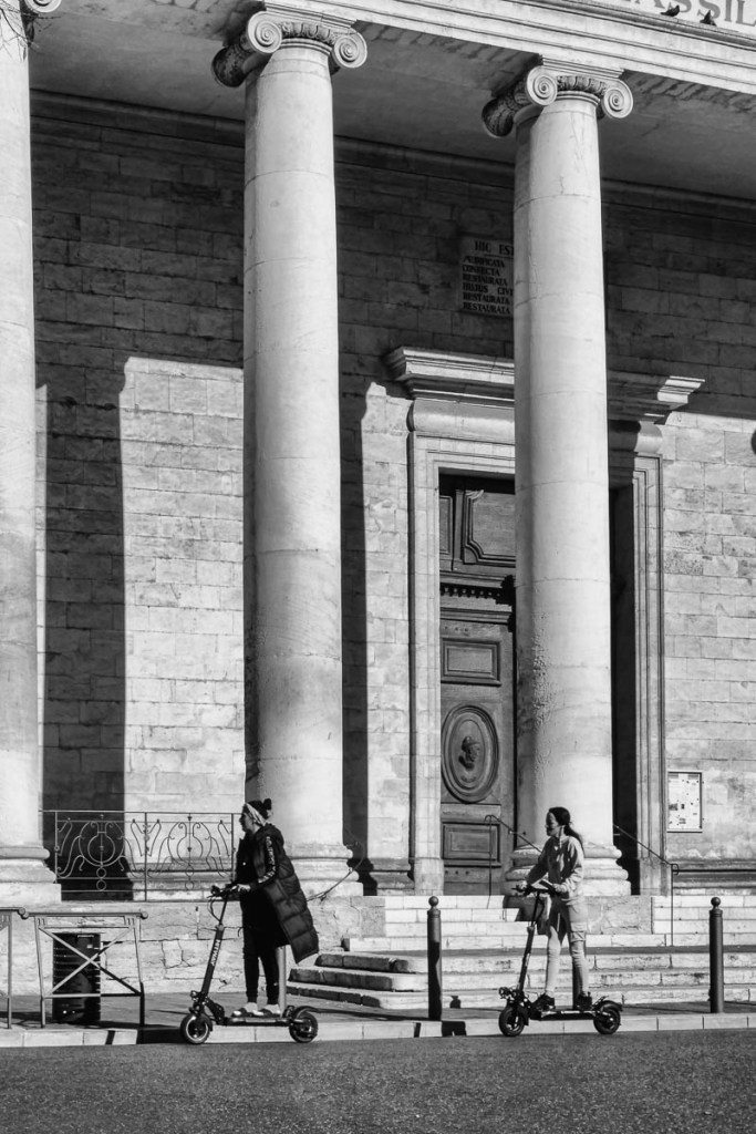 Midi et des poussières, je bois un café en terrasse, au soleil, face à l’imposante église Sainte-Marie Madeleine des Chartreux dans le quatrième arrondissement de Marseille. Le contraste puissant, l’imposante taille des colonnes ioniques (plus de dix mètres de haut !) et l’arrivée des trottinettes me font sortir l’appareil photo de mon sac.
