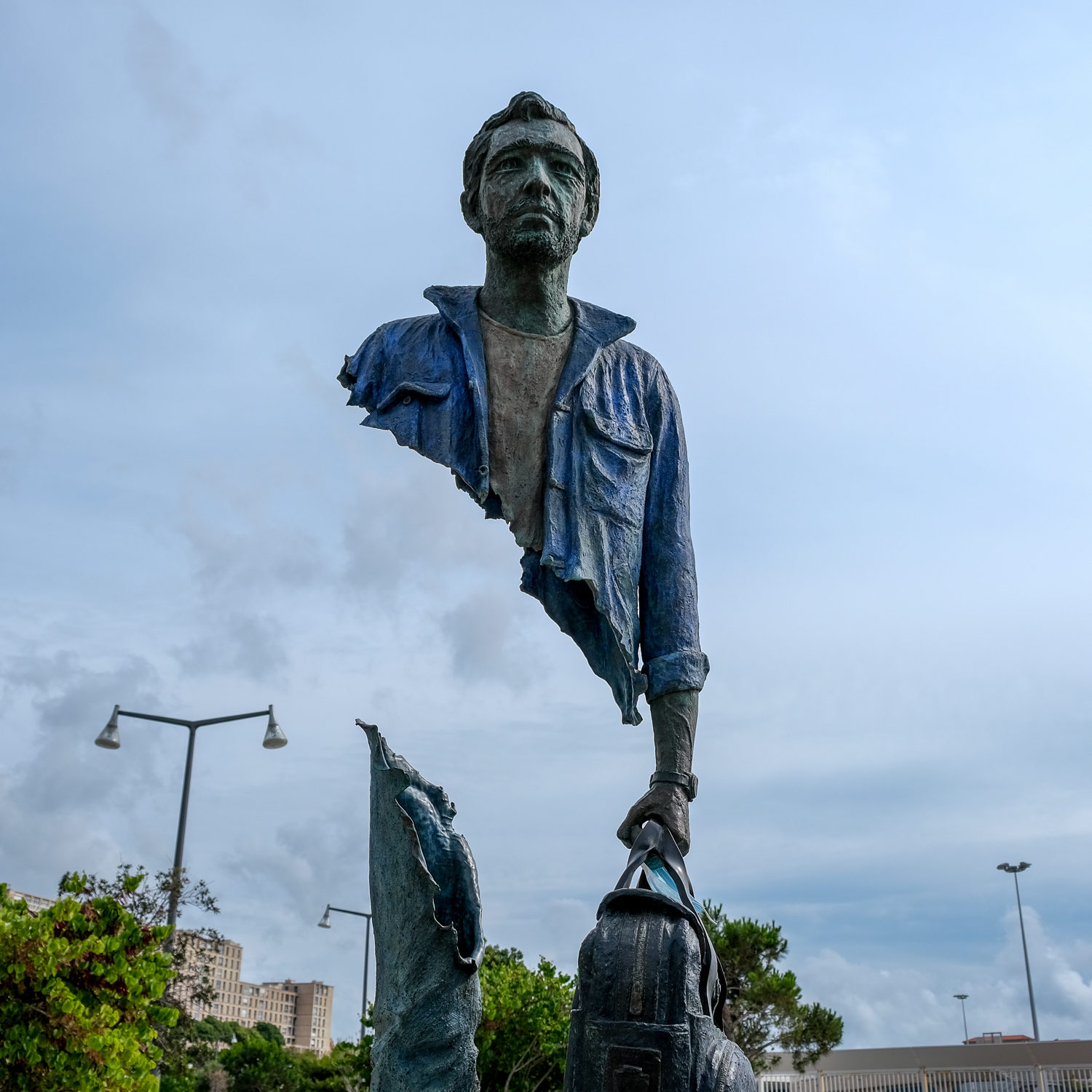 » Bleu de Chine. Œuvre du sculpteur Bruno Catalano. Cette sculpture rend hommage à tous les travailleurs du port de Marseille ainsi qu’à toutes celles et et à tous ceux qui ont recommencé leur vie sur ces quais. Réalisée par la fonderie d’art Barthélémy à Valence (France) en juillet 2018. » Inscription sur la socle de la statue.