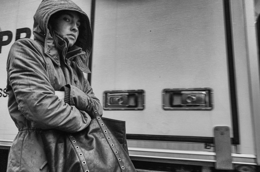 J’arrive sur le Vieux Port sous une pluie fine. De loin, je la vois, bras croisés, à proximité du feu de circulation. Quand je la photographie au moment où un bus passe derrière elle, je distingue à peine son visage dans l’ombre. C’est sur la photo que je découvre qu’elle a repéré mon petit appareil photo.