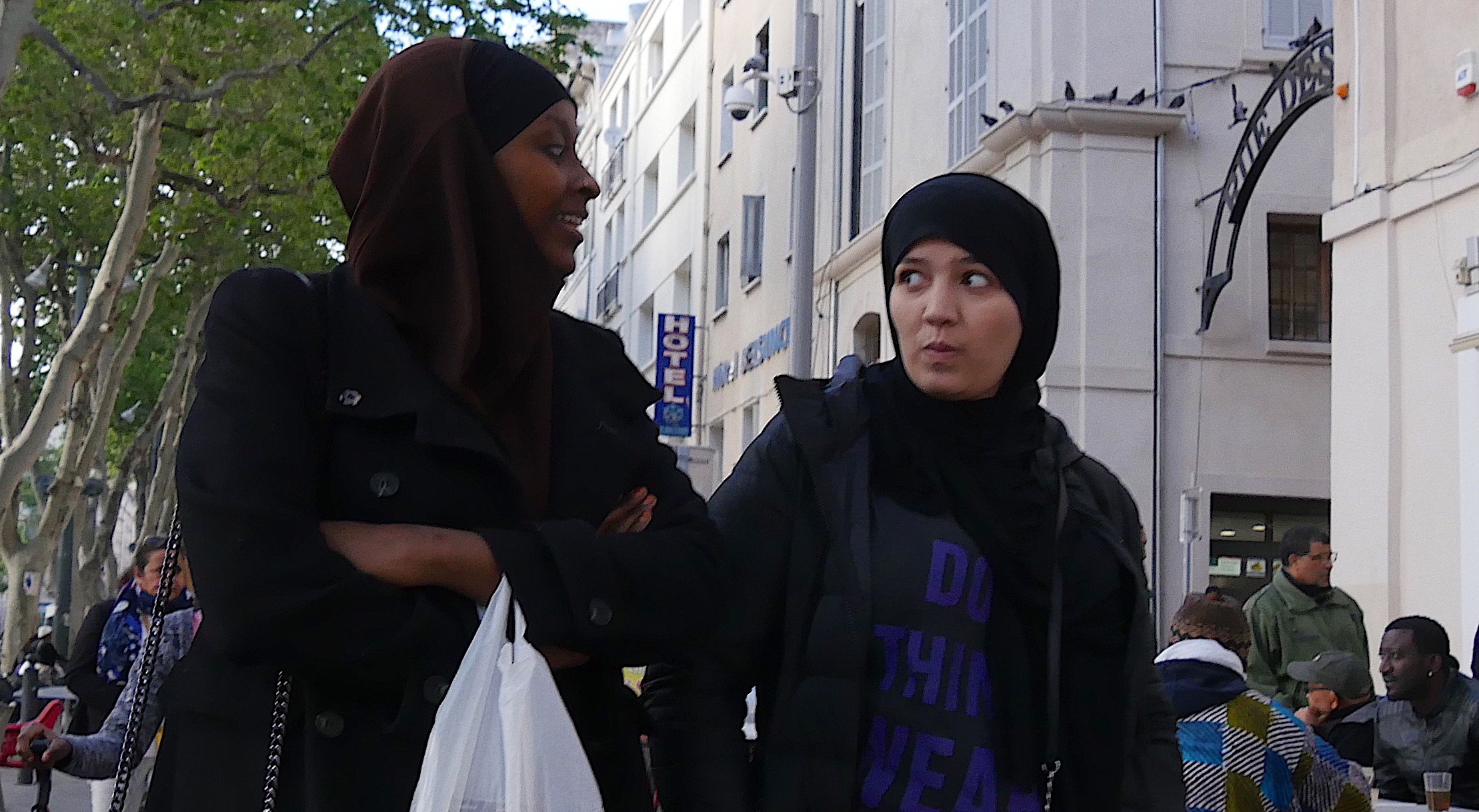 Sur le cours Belzunce, peu avant l’Alcazar, je croise ces deux jeunes femmes en grande conversation. Trop occupées pour me voir, elles sont très rieuses bien que la photo laisse une autre impression.