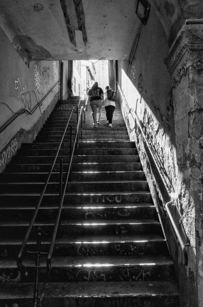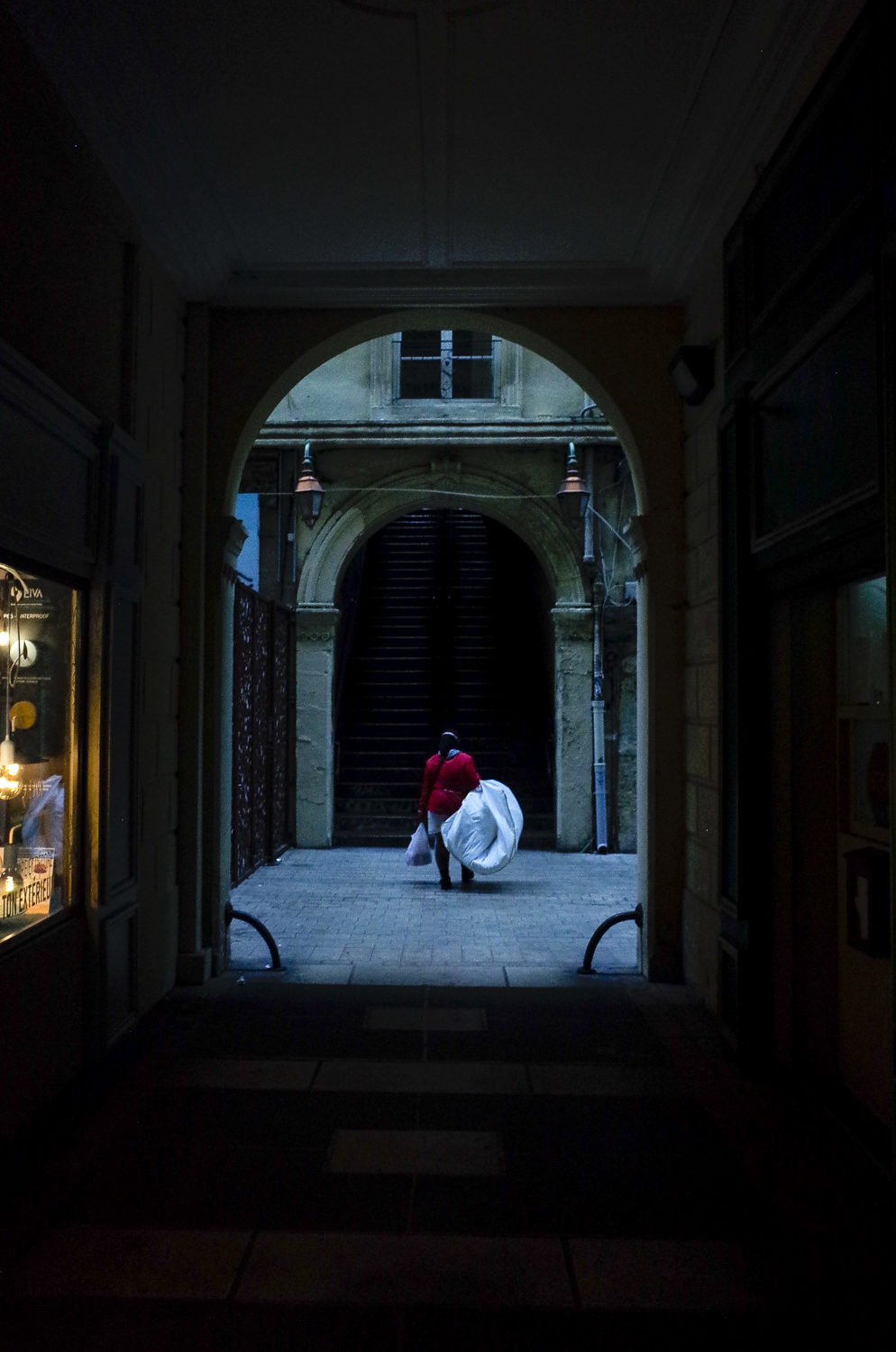 Au loin, je l’aperçois, les bras chargés, sur le trottoir de la rue de la République. Quand elle tourne dans le passage que je connais — un couloir sombre, un espace un peu clair et un escalier dans la pénombre, je pique un petit sprint jusqu’à l’entrée pour la photographier dans la faible lumière de cette fin d’après-midi de janvier. De justesse.