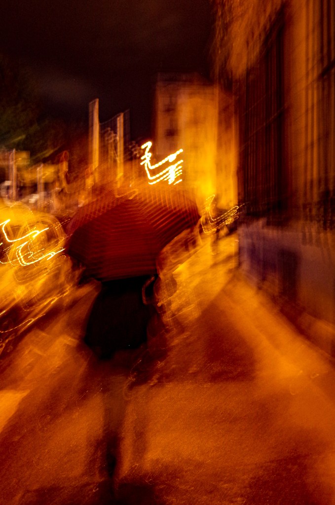 Encore le soir. Pas tard. Il tombe quelques gouttes. Elle sort d’une allée quelques mètres devant moi, ouvre son parapluie et démarre d’un pas si rapide que je peine à rester à bonne distance pour photographier cette silhouette et son joli parapluie.