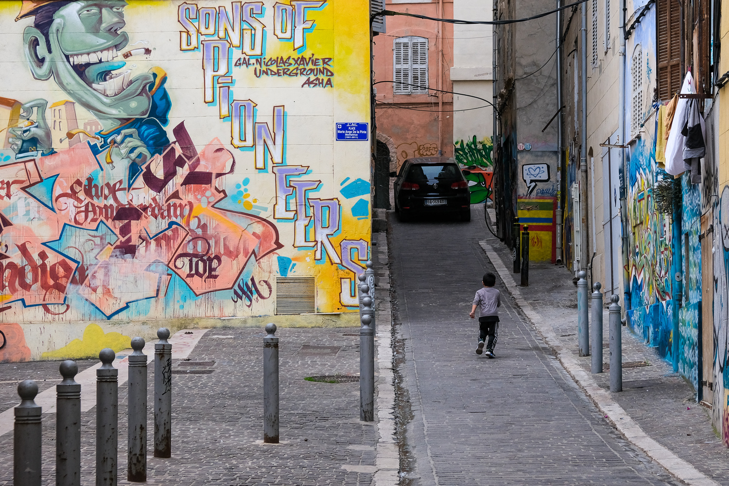 Fin d’après-midi dans le quartier du Panier. On fait des photos avec mes camarades du mercredi. Alors qu’on remonte une petite rue paisible, arrive derrière nous un gamin qui passe au petit trot, sans un regard, puis disparaît au fond de la rue. Salut !