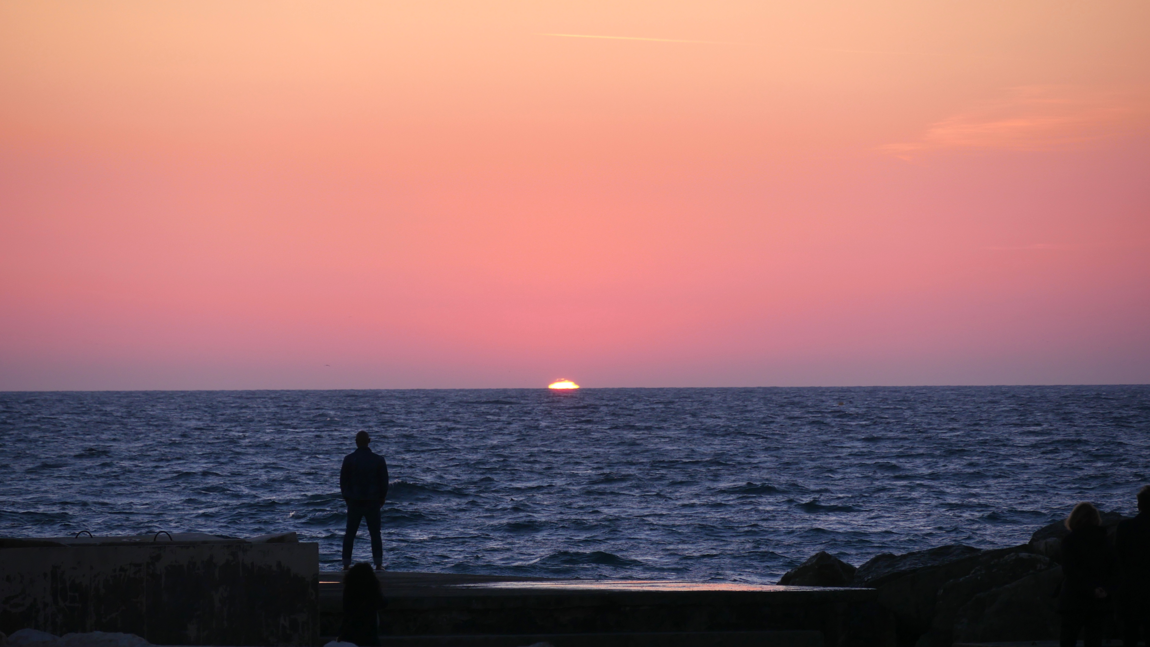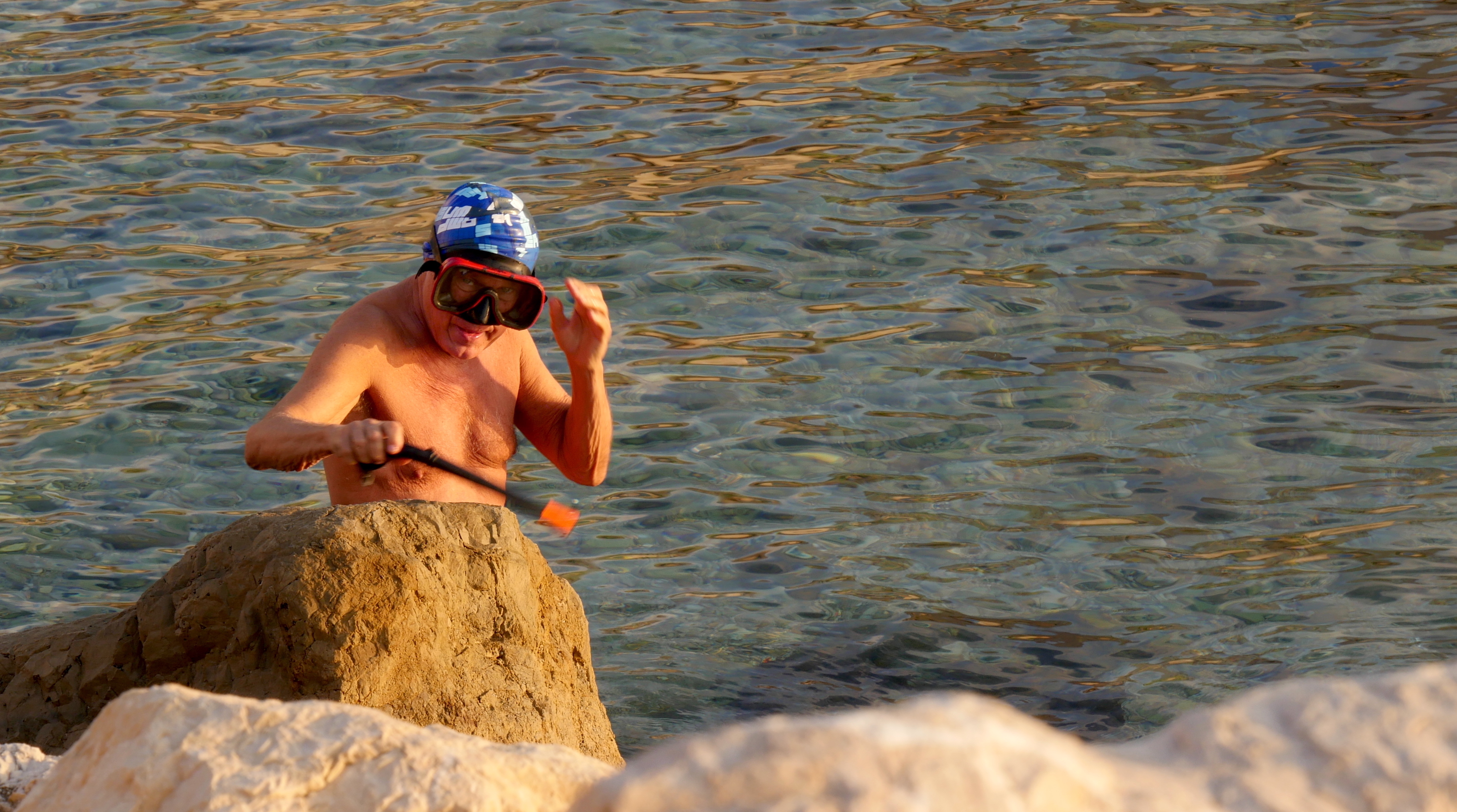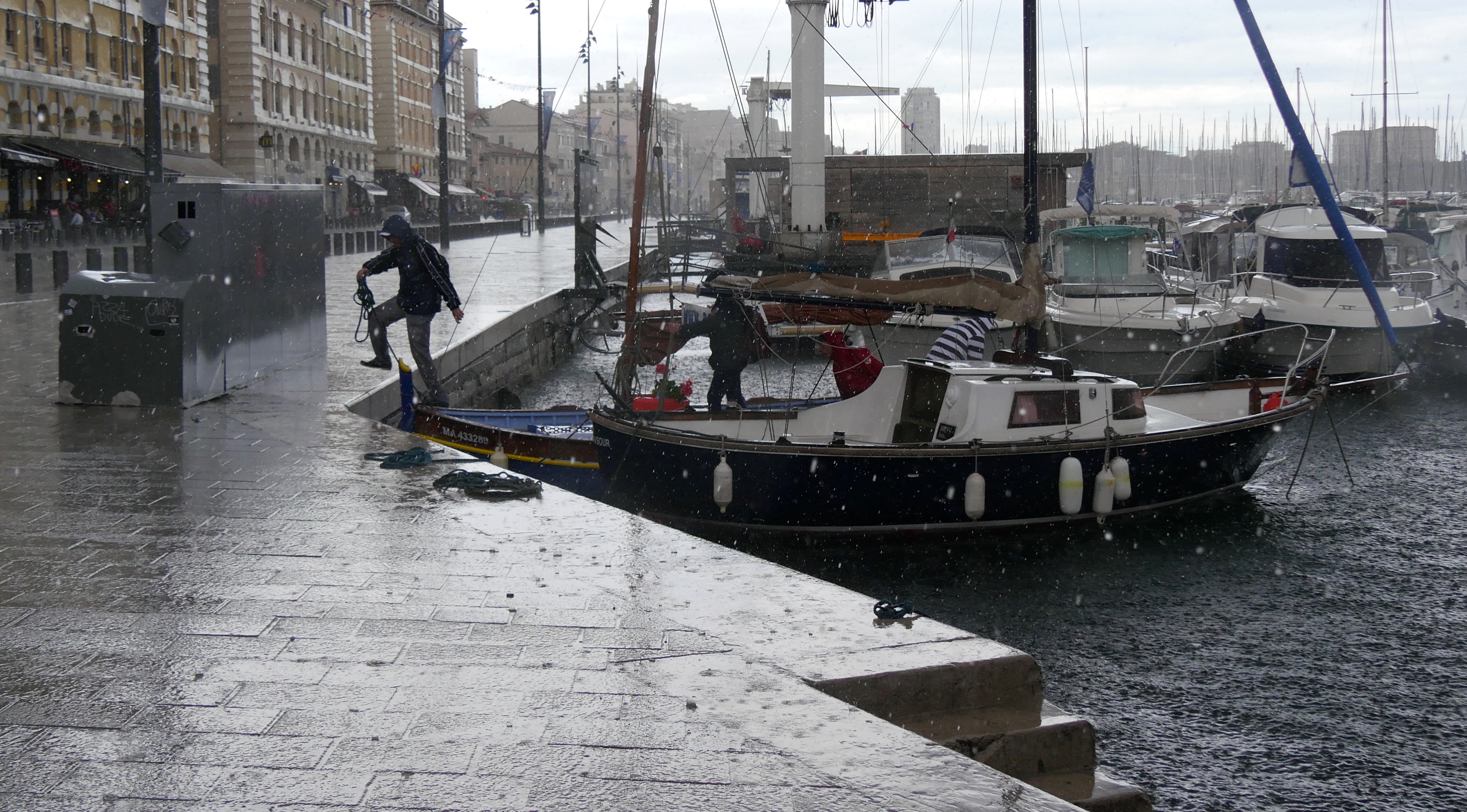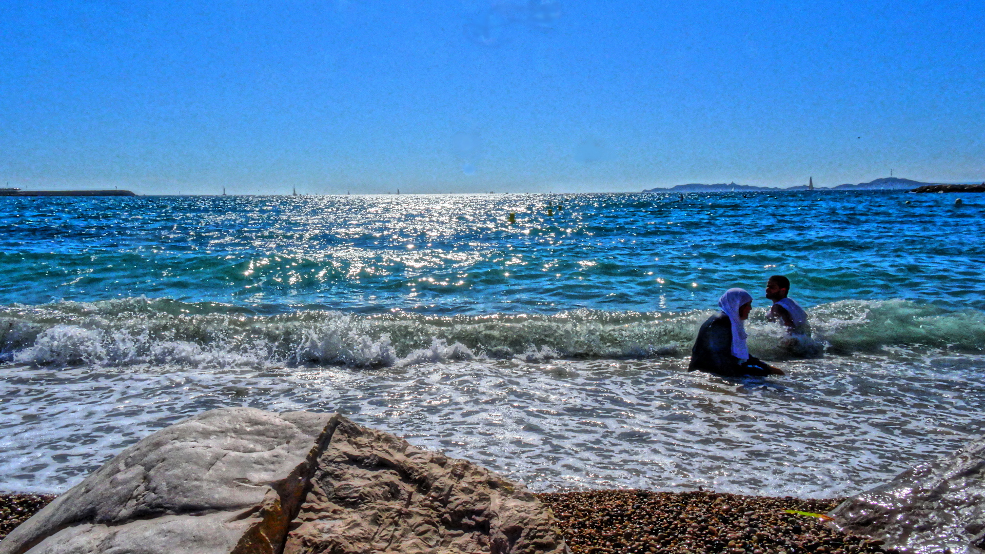 Grand soleil et Mistral à décorner les bœufs sur la corniche. Je me tiens à l’écart pour éviter les gerbes d’eau pulvérisées par le vent tandis que les mouettes s’en donnent à cœur joie.