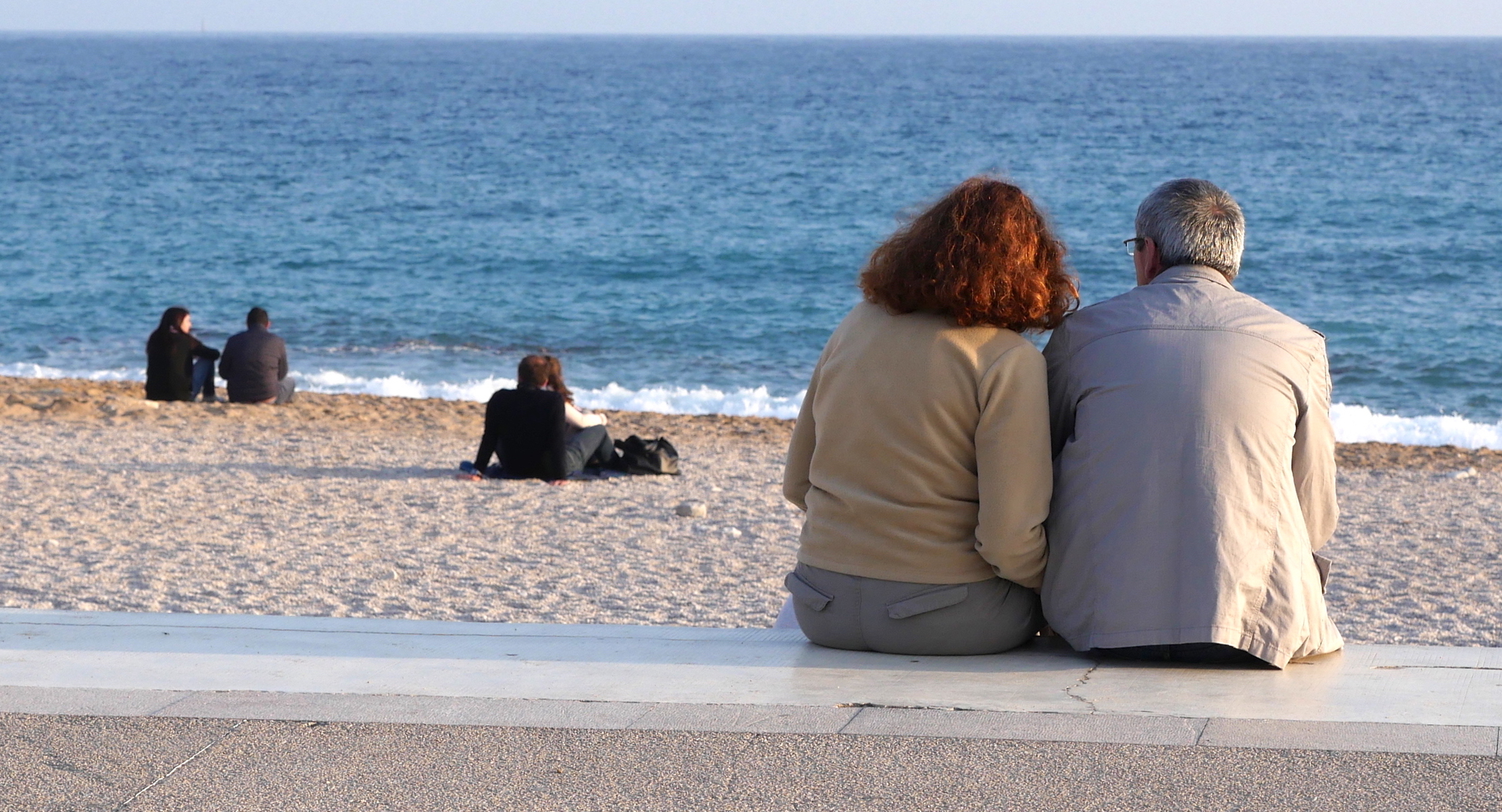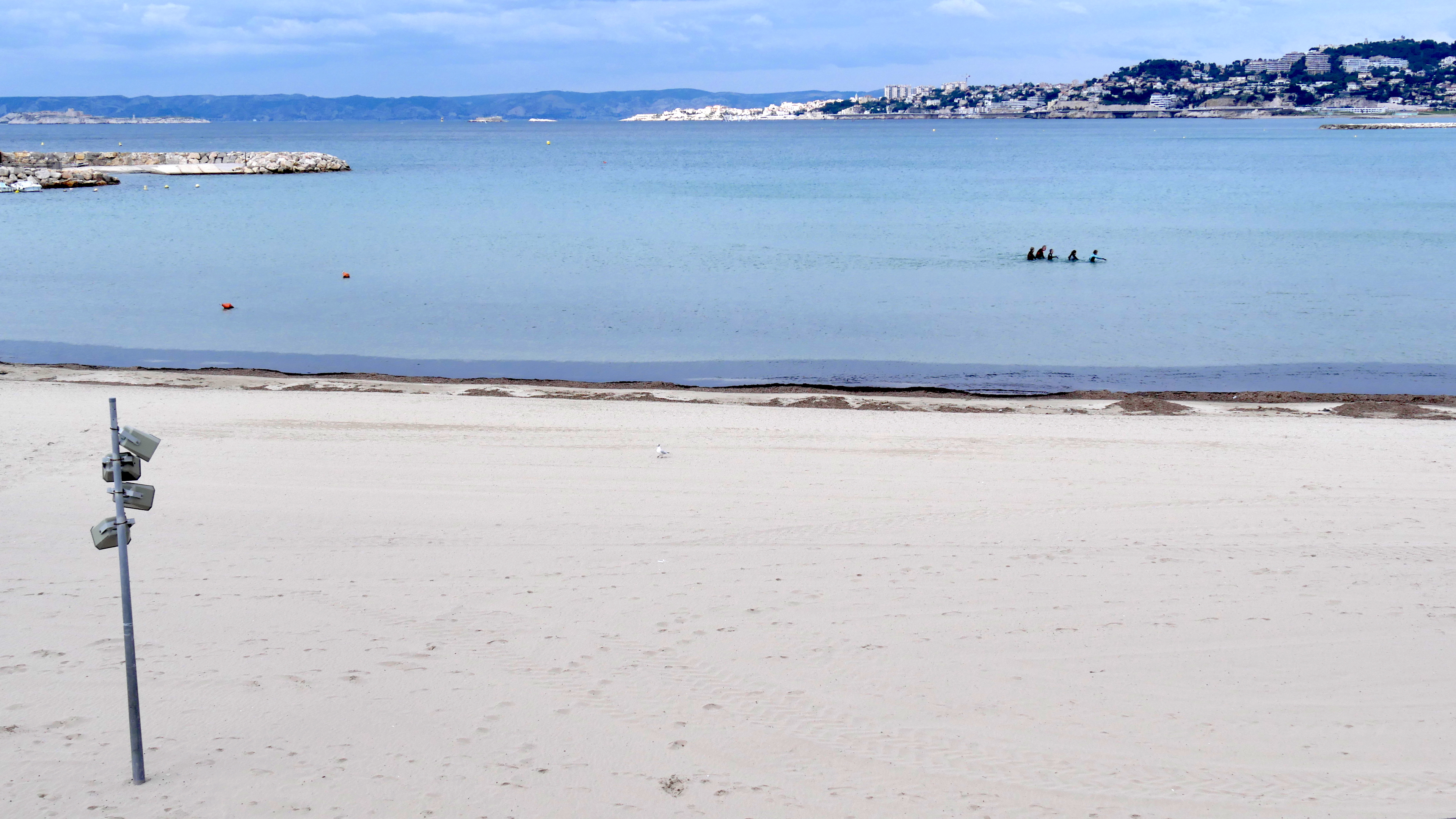 Je m’arrête au bord de la route, au-dessus de la plage pour observer les marcheurs dans l’eau du jeudi matin, membres d’une même association de randonneurs. Ils avancent, l’eau au niveau de la taille, dans un sens puis font demi-tour, accélèrent, ralentissent pour se réchauffer dans l’eau fraîche du mois de mars.