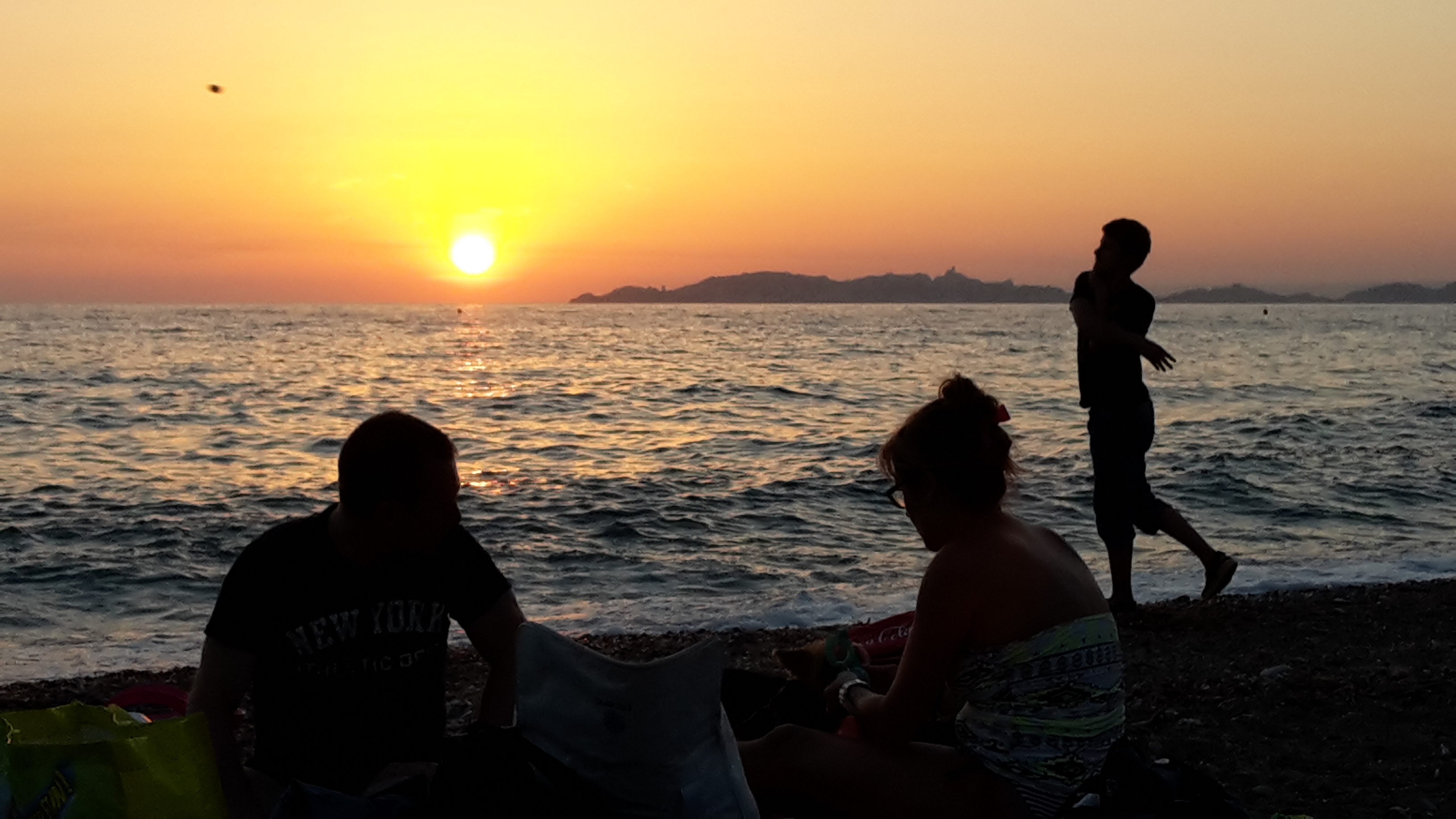 C’est le mois de novembre (2015) sur la plage de la Pointe Rouge. Il fait frais en cette fin de journée, je n’ai que mon téléphone sous la main pour photographier ce couple les pieds dans l’eau.