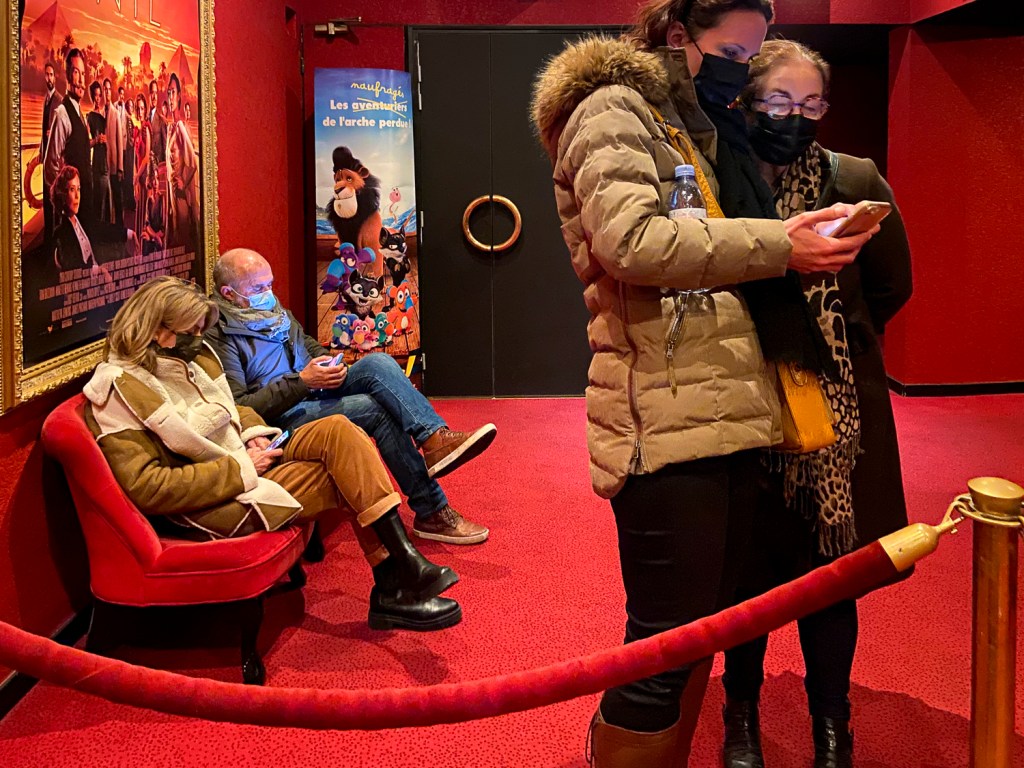 En patientant avant la séance. Un cliché qui résume notre époque : masque et téléphone portable, ce bidule qui nous rapproche des autres et nous fait (trop souvent) oublier le voisinage. Je fais de même puisque je l’utilise pour faire cette photo…