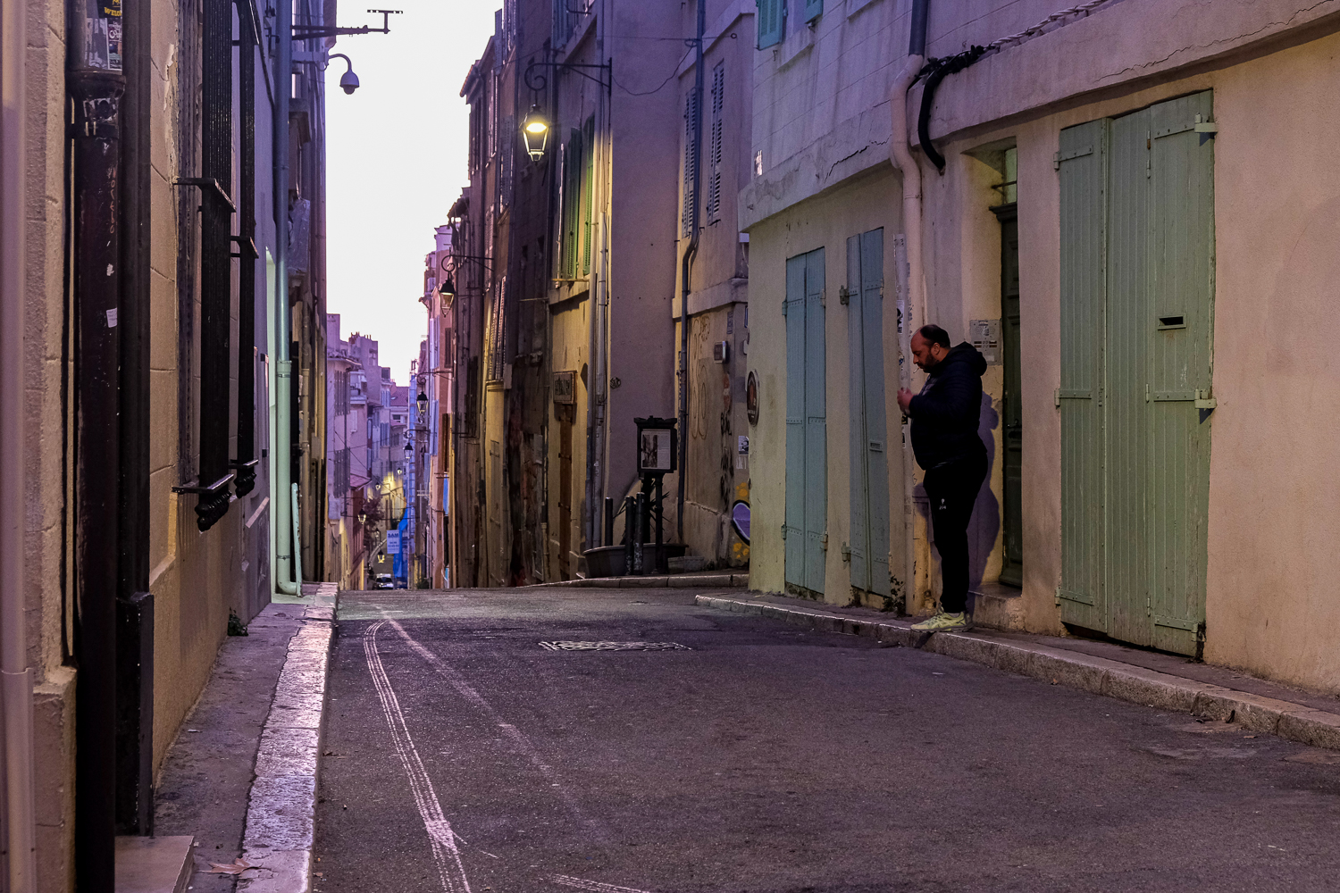 Fin d’après-midi dans le quartier du Panier, il fait froid, pas un chat dans la rue. Appuyé contre un mur, j’admire la perspective et la lumière du soir quand il sort de l’allée et s’immobilise un instant sur le pas de la porte. Il jette un œil à son portable (clic), se tourne dans ma direction et passe près de moi, téléphone à la main.