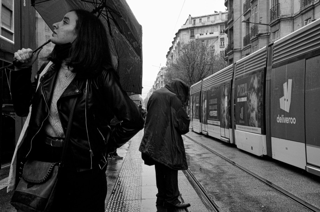 Arrêt de tram des Cinq Avenues. J’ai un parapluie dans la main gauche et mon petit appareil photo dans la main droite, à l’abri des gouttes. Je rate la photo du monsieur à l’imperméable trempé (de dos, au centre de l’image) quand il passe près de moi. Mais je profite du moment où la jeune femme au parapluie jette un œil sur une affiche.