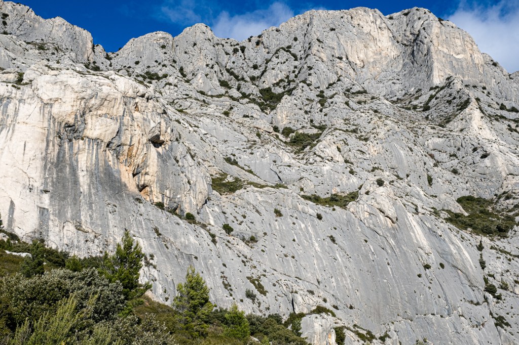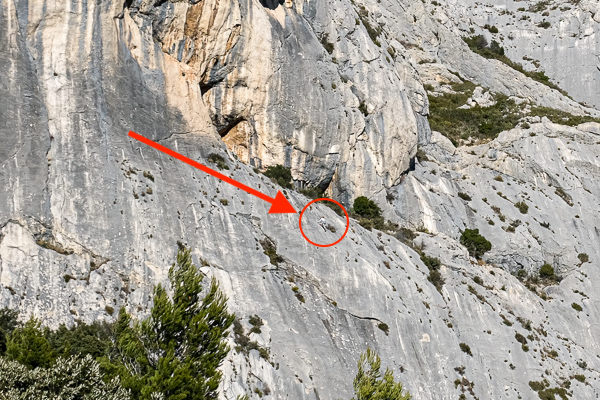 Une fois n’est pas coutume, petite randonnée pédestre dans la Sainte Victoire un jour de grand soleil… et de grand vent. Un(e)* téméraire alpiniste en pleine action donne l’échelle, mais il faut le (la) trouver ! Indice : il (elle) est dans la partie gauche de l’image.