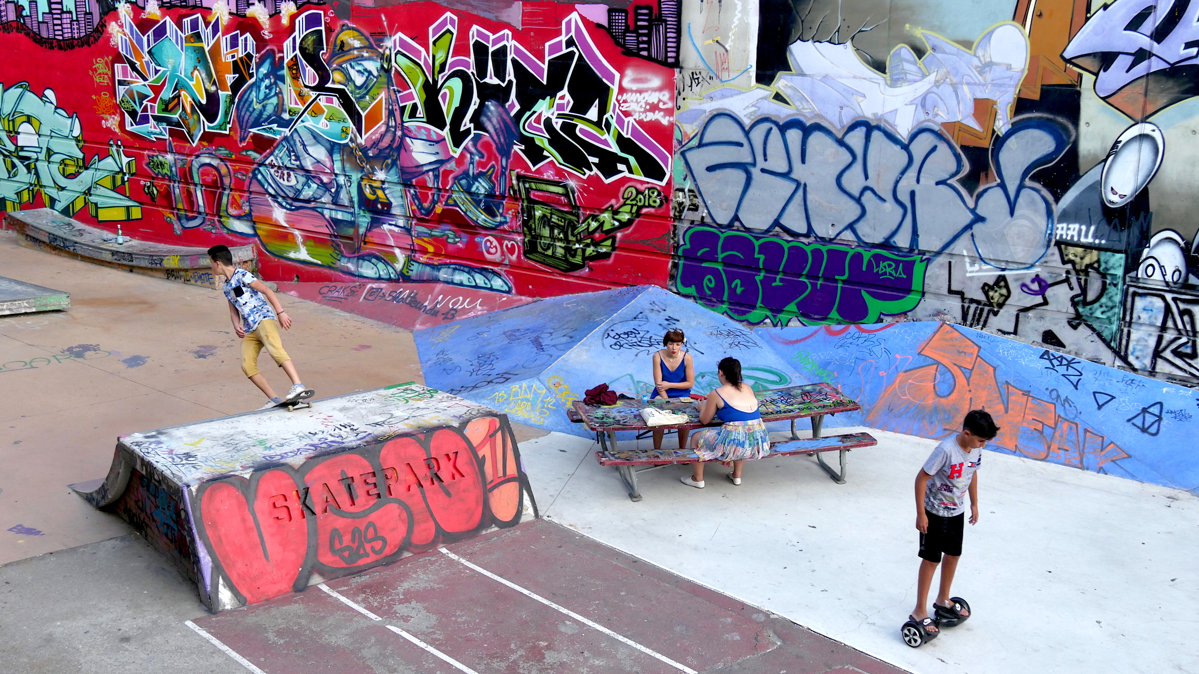 Du premier étage de la Friche, j’attends que les jeunes gens mobiles sautent, tournent, croisent les deux femmes attablées, totalement indifférentes à leur environnement à roulettes. Et voilà !