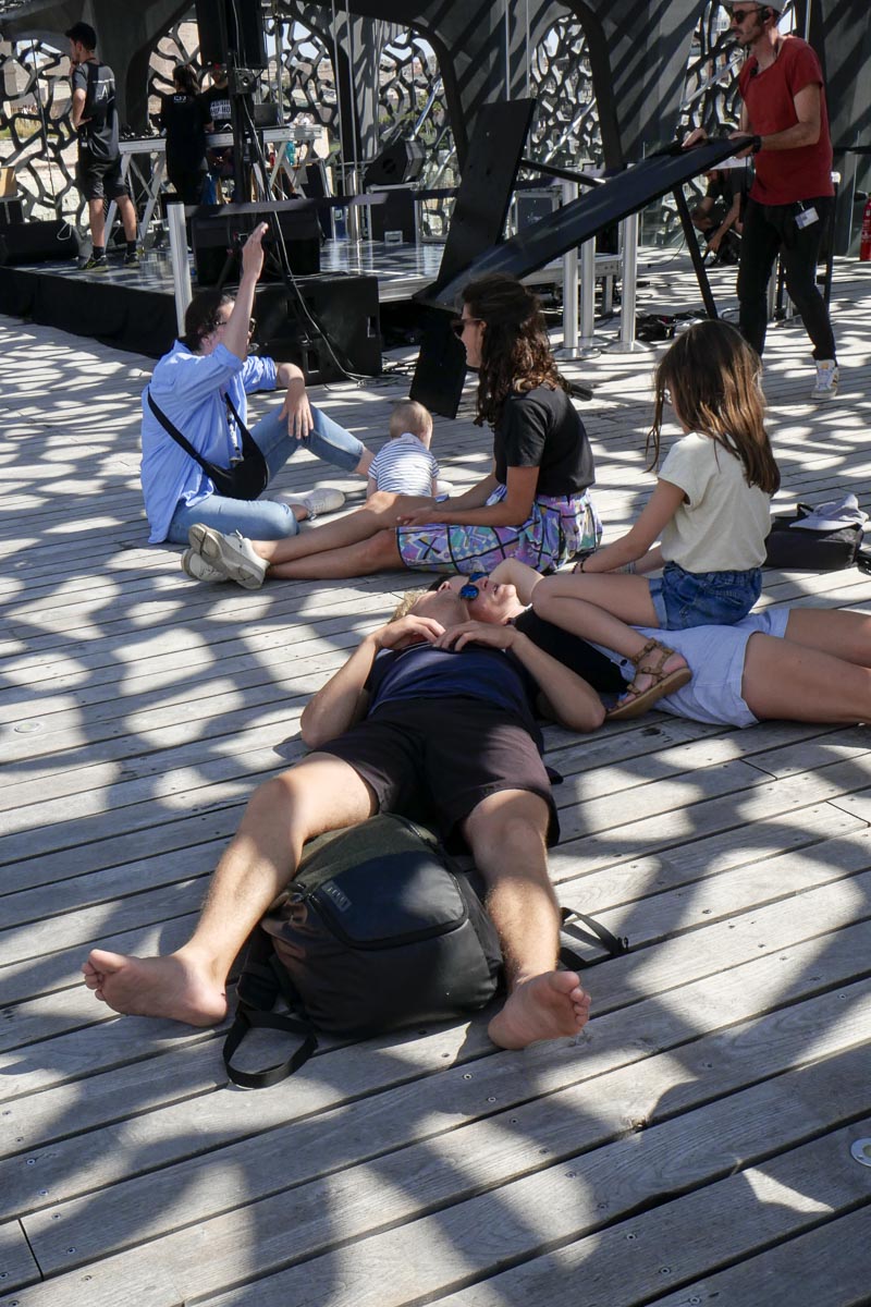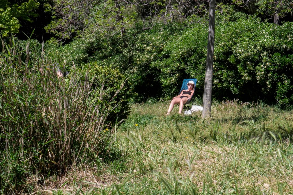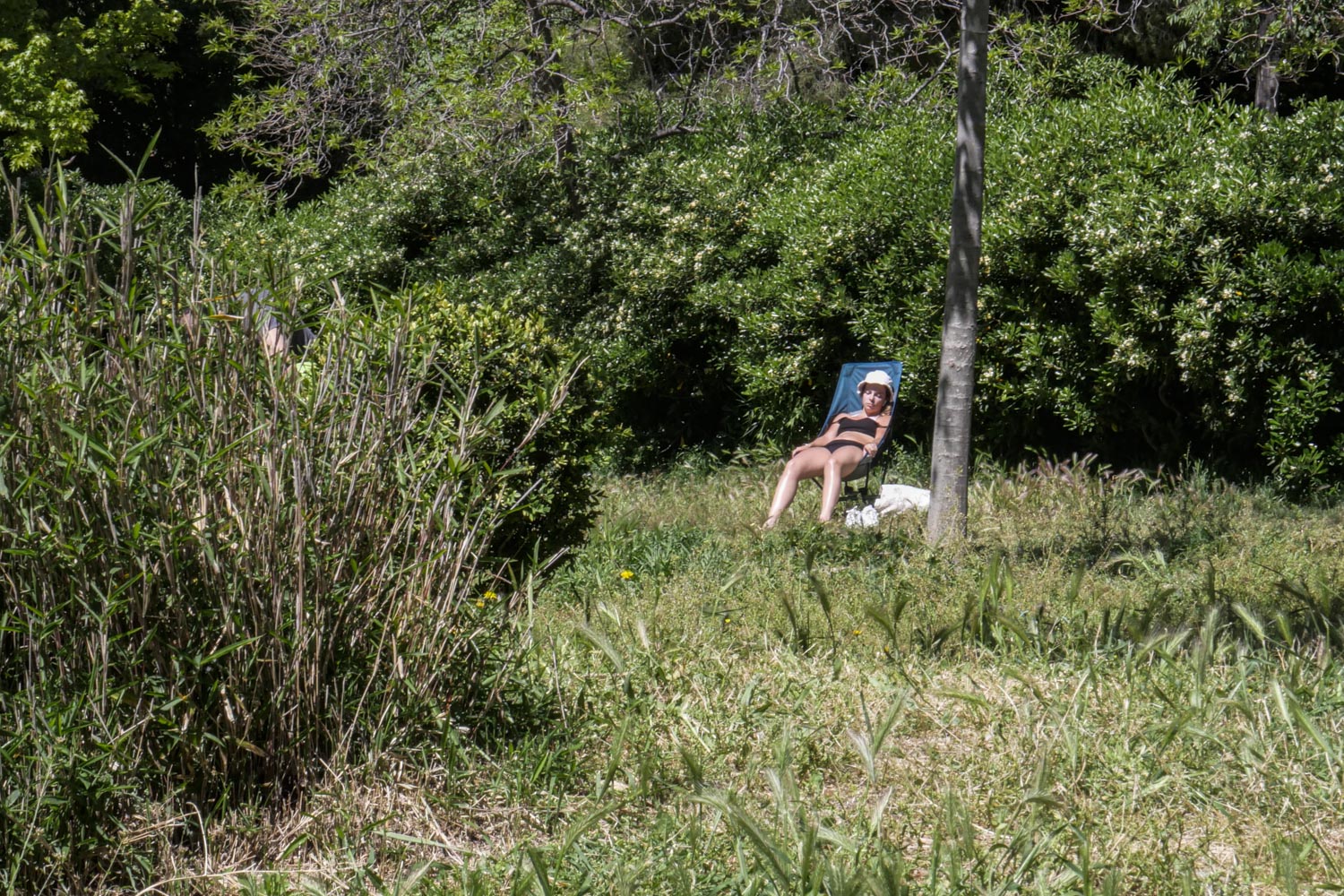 Par une journée radieuse, je traverse le parc jusqu’à l’entrée dans la rue du Jardin zoologique. Peu avant le portail, je découvre cette dame en plein bronzage, perdue dans une végétation qui fait plus penser à la campagne qu’à un parc urbain. Et elle n’est pas vraiment seule : en regardant de plus près, on devine l’épaule et le bras d’un homme derrière le buisson, à gauche au premier plan. J’ai attendu qu’il soit masqué pour faire la photo 😉