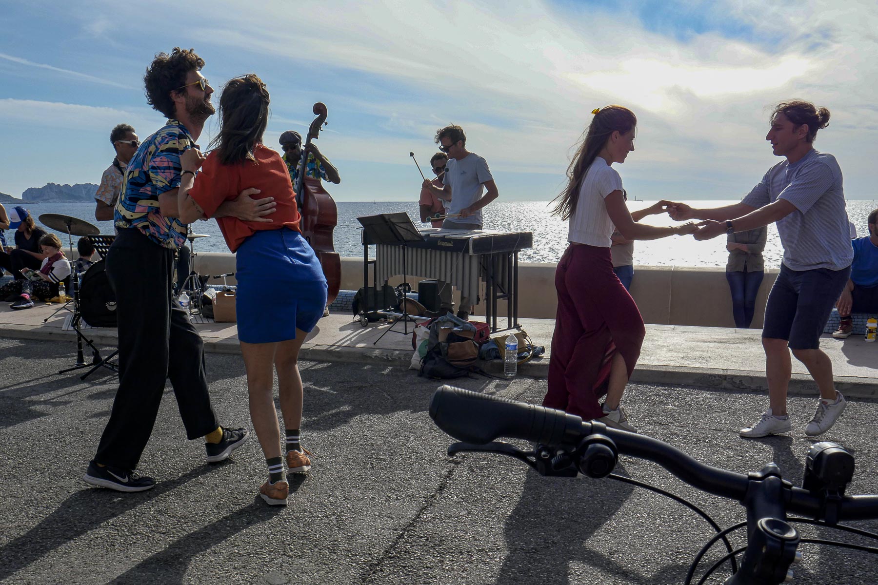 Quand la Corniche est « rendue » aux piétons, vélos, trottinettes, comme le dimanche 25 septembre, l’ambiance n’a plus rien à voir avec le quotidien bruyant, pollué et tendu. Je descends de mon vélo quand je passe devant ces jeunes gens.