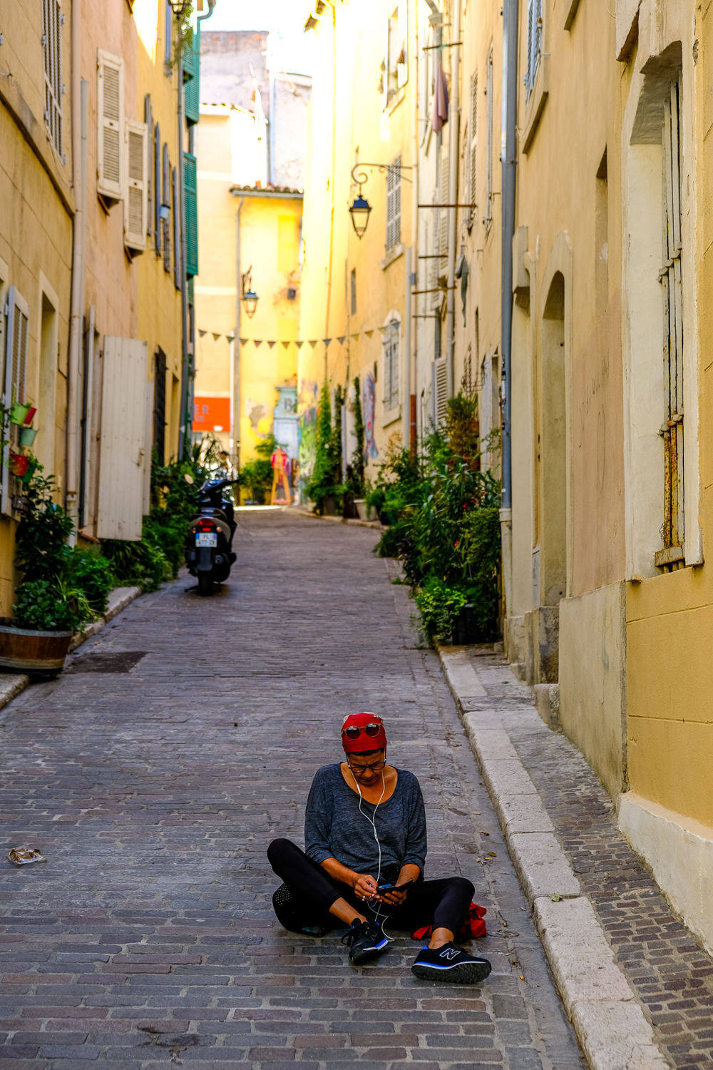 Très occupée par son téléphone, elle rédige un texto. J’ai le temps de cadrer. Heureusement, il y a peu de circulation automobile dans les rues étroites du Panier.