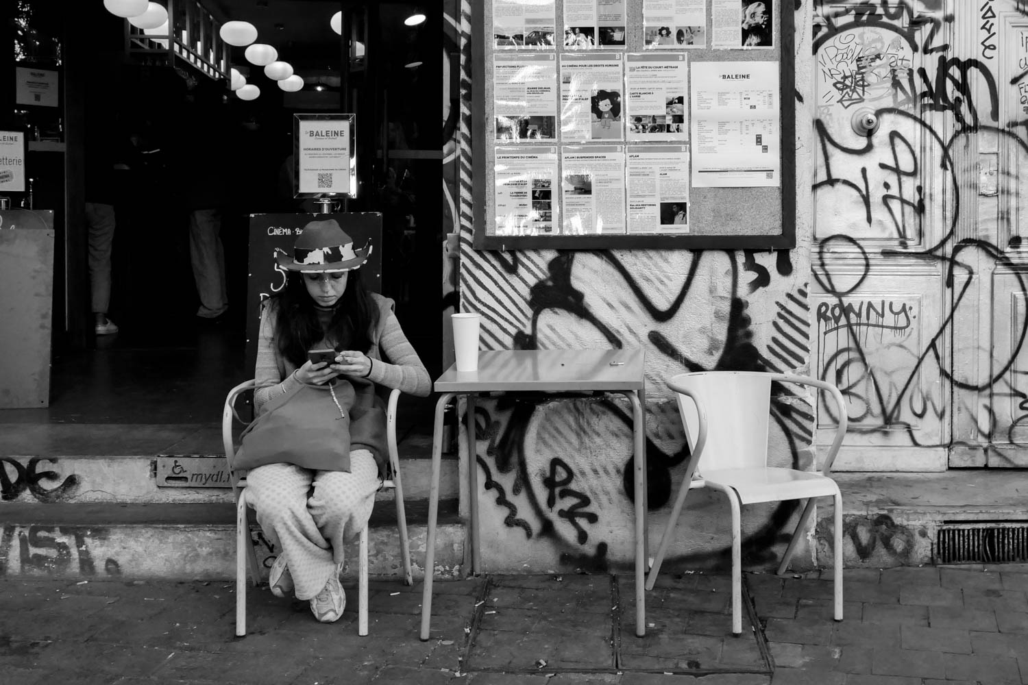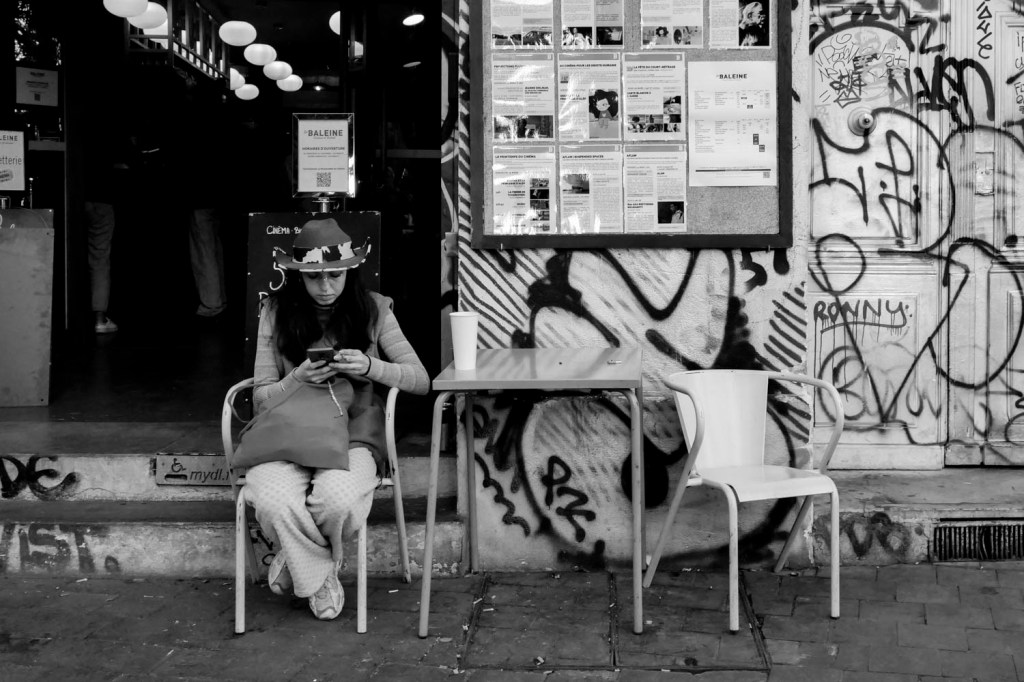 Quand j’emprunte le tourniquet vitré qui donne sur la terrasse du centre commercial, je tombe sur cette image. Grand soleil, je suis un peu ébloui, je crois photographier un type assis occupé sur son téléphone (c’est le cas, je me suis approché pour jeter un œil) et, au premier plan, une femme debout dans le vent, enveloppée dans un voile. Les apparences sont parfois trompeuses.