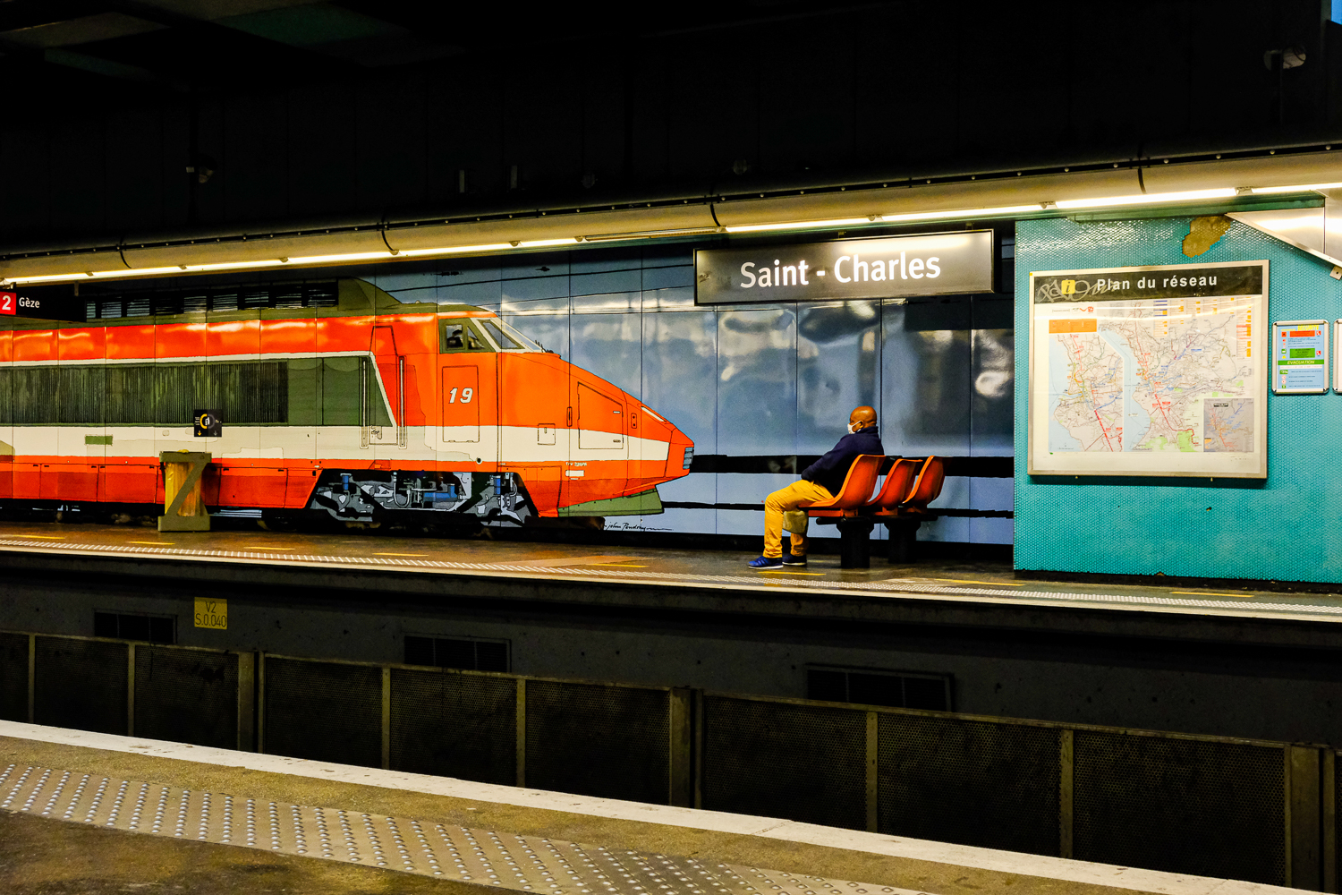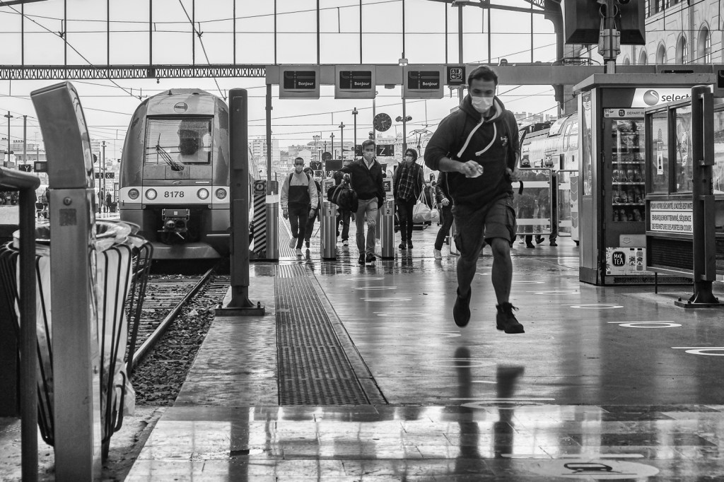 C’est le matin, vers 9 h, je suis assis avec mon bouquin, seul, dans le wagon. Le temps maussade ne donne pas envie de s’intéresser au paysage. Plongé dans Le Passage de Justin Cronin, je ne l’entends pas arriver, je ne la vois pas s’assoir ni s’allonger. Quand je lève la tête, en entendant le nom de ma destination dans le haut-parleur, je vois ce que vous voyez sur la photo.