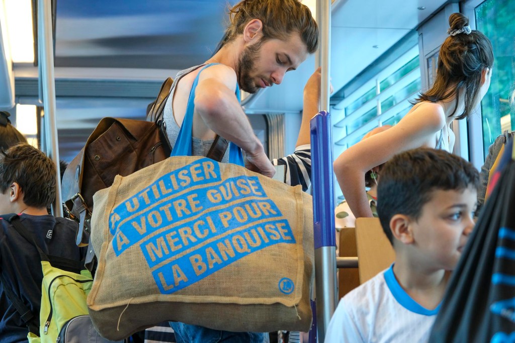 Arrêt de tram des Cinq Avenues. J’ai un parapluie dans la main gauche et mon petit appareil photo dans la main droite, à l’abri des gouttes. Je rate la photo du monsieur à l’imperméable trempé (de dos, au centre de l’image) quand il passe près de moi. Mais je profite du moment où la jeune femme au parapluie jette un œil sur une affiche.