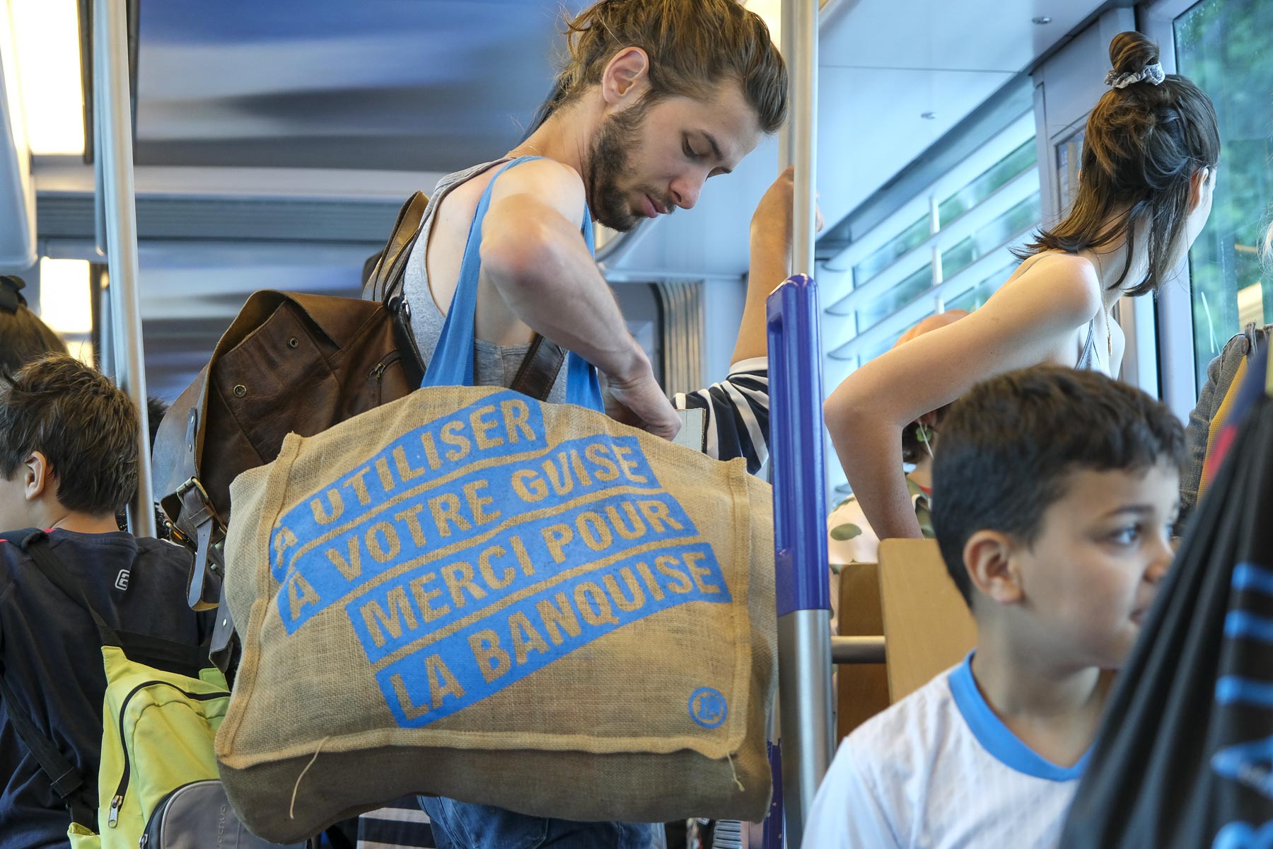 Arrêt de tram des Cinq Avenues. J’ai un parapluie dans la main gauche et mon petit appareil photo dans la main droite, à l’abri des gouttes. Je rate la photo du monsieur à l’imperméable trempé (de dos, au centre de l’image) quand il passe près de moi. Mais je profite du moment où la jeune femme au parapluie jette un œil sur une affiche.