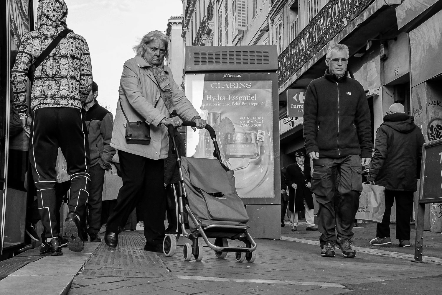 Pas facile de se croiser sur l’étroit trottoir quand le bus stoppe à l’arrêt Flammarion Siphon. Cette dame surgit de l’ombre au moment où je mets mon appareil en marche. Clic !
