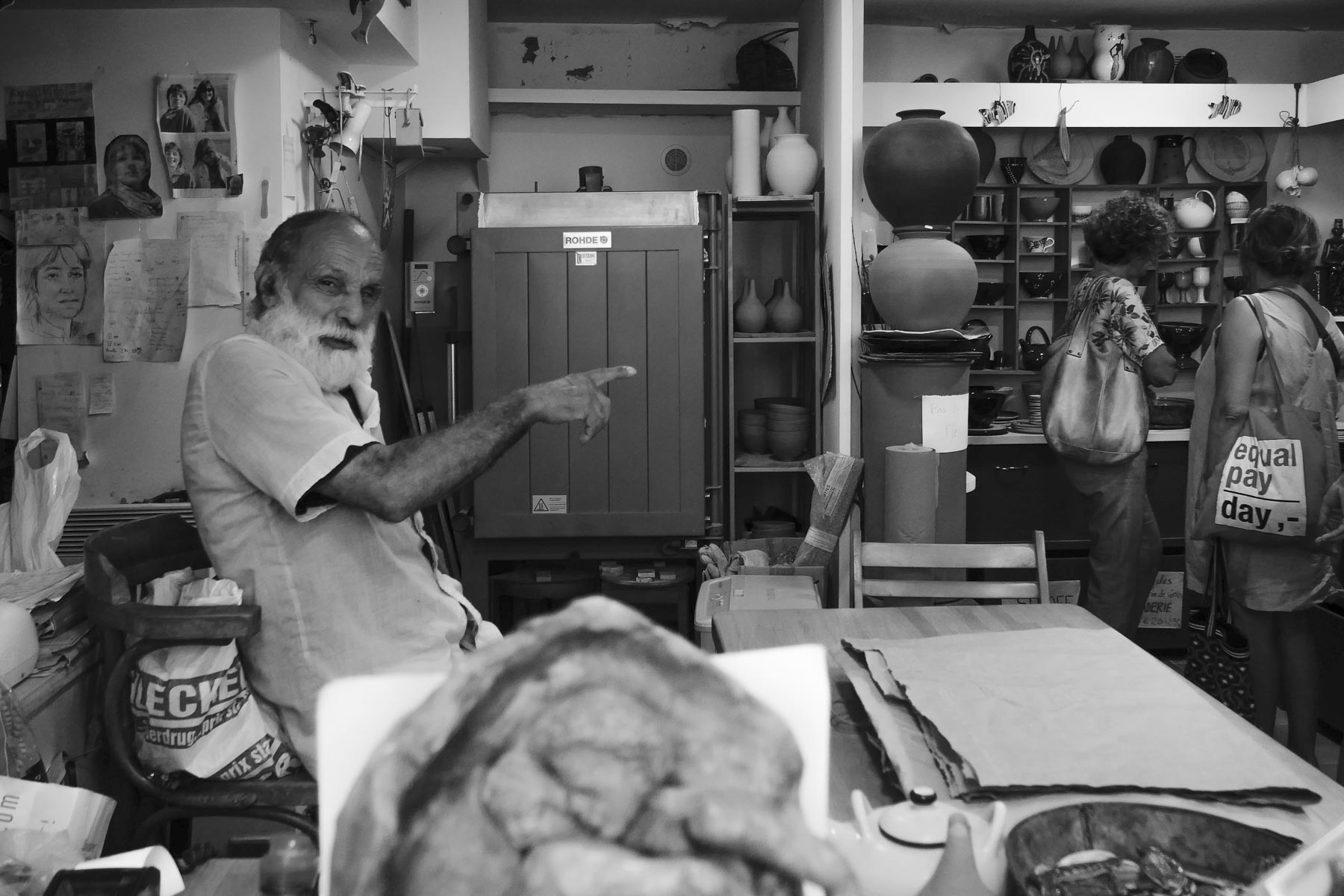 Au cœur du Panier, je suis dans l’Atelier d’Agnès où se trouvent de belles poteries : vases, assiettes, tasses et saladiers comme celui que j’ai cassé à la maison. Je viens chercher son remplaçant tout beau, tout neuf. L’homme sympathique qui tient la boutique me prie de photographier les clientes. Je l’ai fait, bien sûr, mais je préfère sa tête à lui.