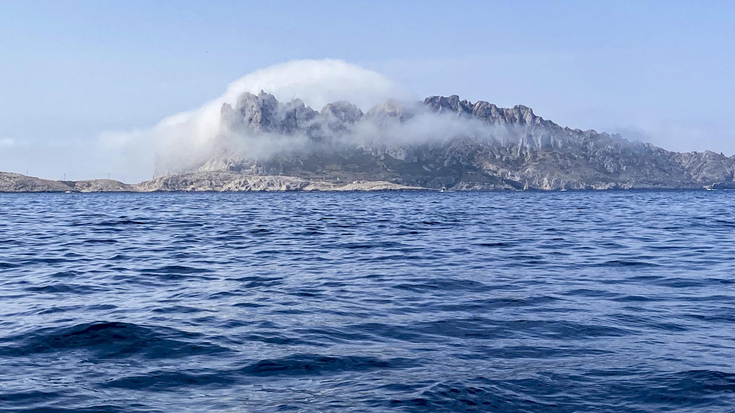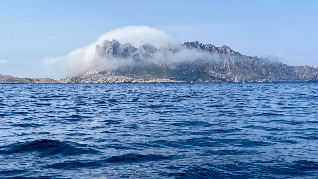 C’est le nom de cette petite île à l’extrémité sud de Marseille, vue d’un petit bateau. Un beau matin, un soleil un peu voilé et une écharpe de nuages qui serpente, se transforme, s’étire autour des sommets. On a fait le tour de l’île à la rame. Un bonheur.