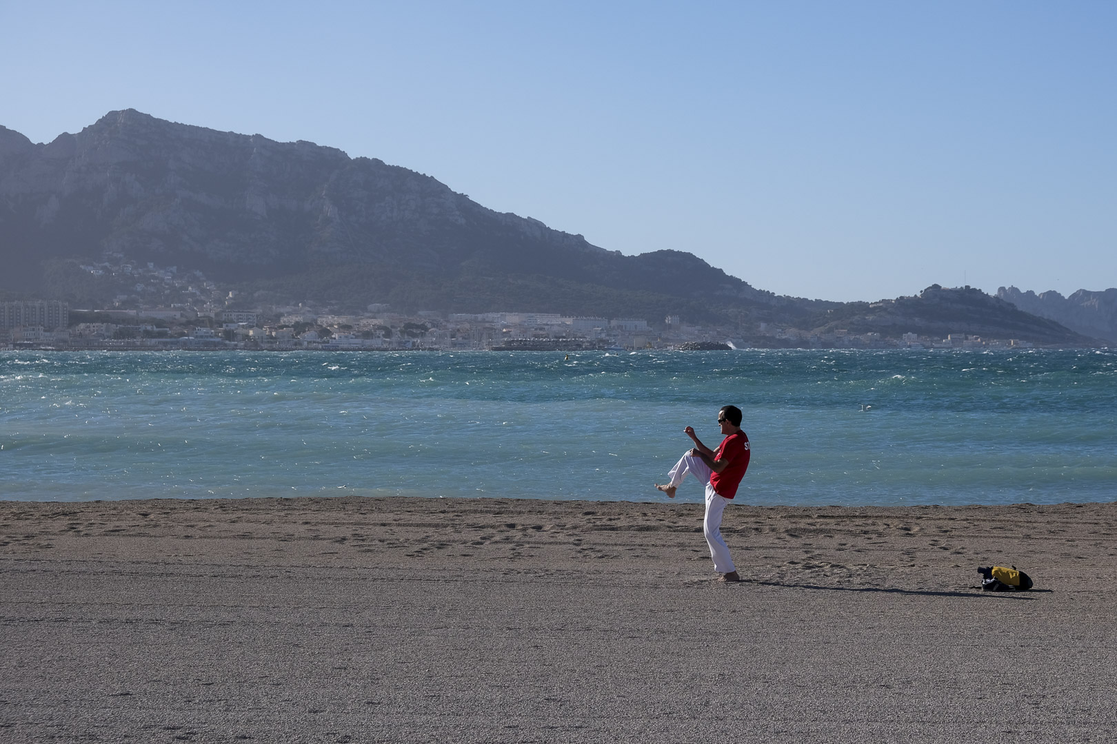 Un matin de février venté. Trois jours que ça dure. Sur les plages, quelques joggeurs, des téméraires qui longent la mer, pas trop près du bord pour éviter les embruns, un baigneur qui fait un aller retour si rapide dans l’eau que j’ai raté la photo, un gymnaste. Et des travailleurs dans le vent.
