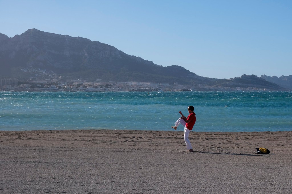 Je le vois de loin un matin de grand vent. Le froid a fait fuit les promeneurs et les contemplatifs, mais il demeure imperturbable. Assis sur un muret, je l’observe de loin : il passe de l’immobilité totale à des figures au ralenti ou très rapides, comme s’il avait un adversaire face à lui.