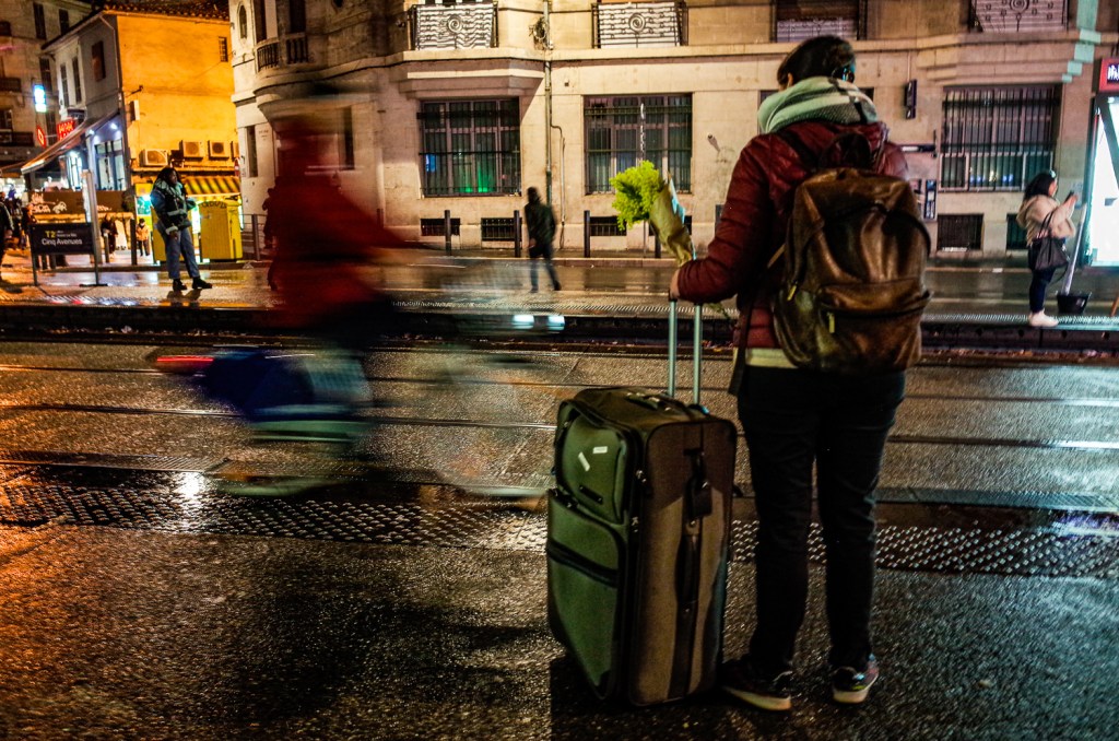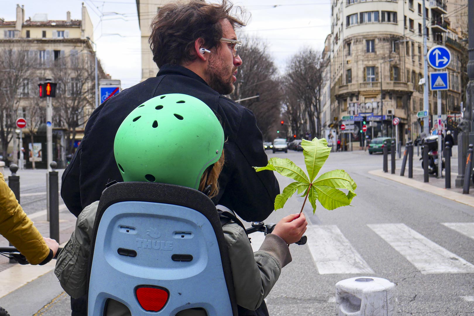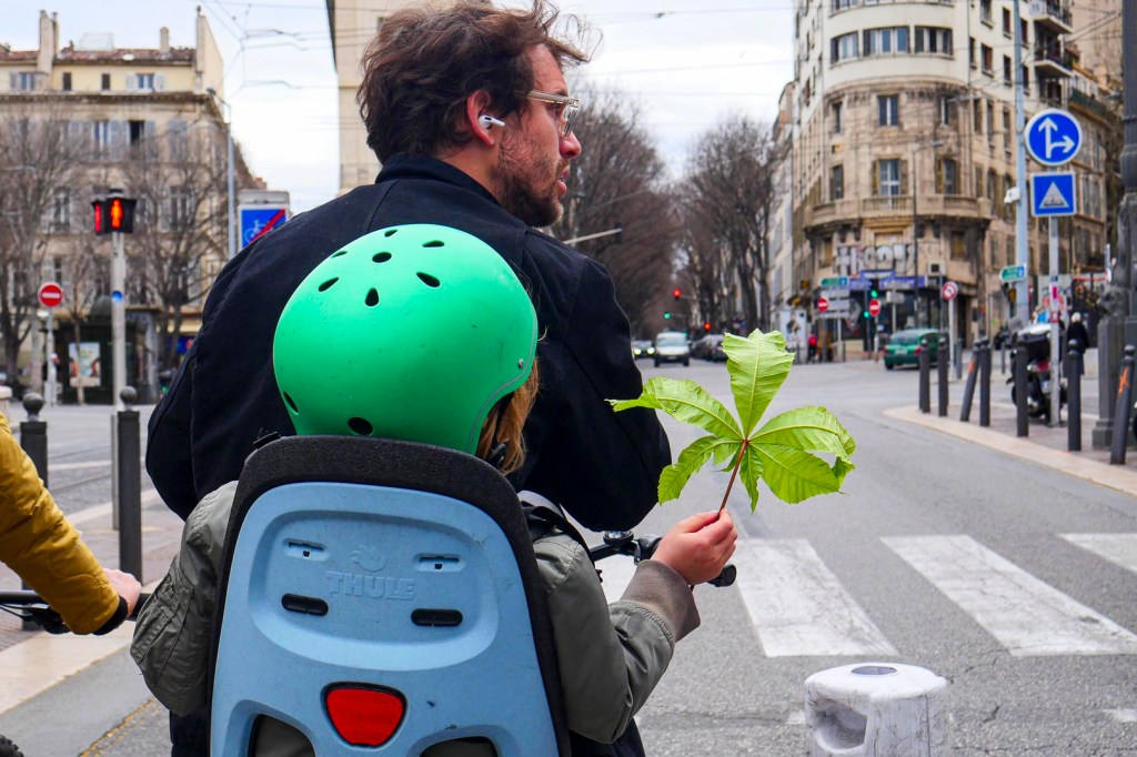 Un dimanche où la Corniche est réservée aux vélos, skate-boards, planches à roulettes, trottinettes et tout ce qui roule sans moteur à explosion. Sur son grand vélo, je suppose qu’il y va comme moi. Sur mon petit vélo, je le double dans la descente sur la Canebière et je le photographie en roulant quelques mètres devant lui. Pas très prudent…