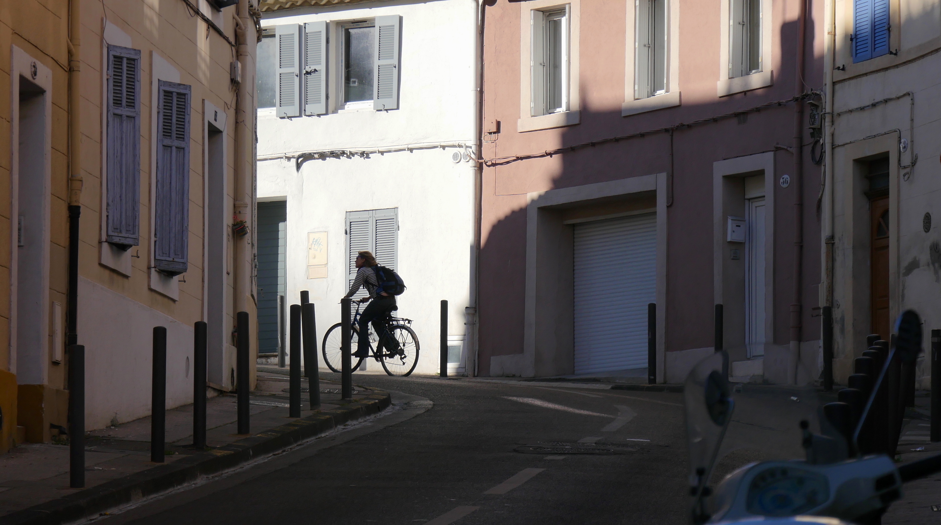 L’une des rues qui serpente jusqu’à Notre-Dame de la Garde. Ce n’est pas très visible sur l’image (je me répète : on voit mieux sur le blog !) mais la rue en question est très pentue. Ce qui ne gêne pas cette jeune femme sur son vélo même pas électrique.