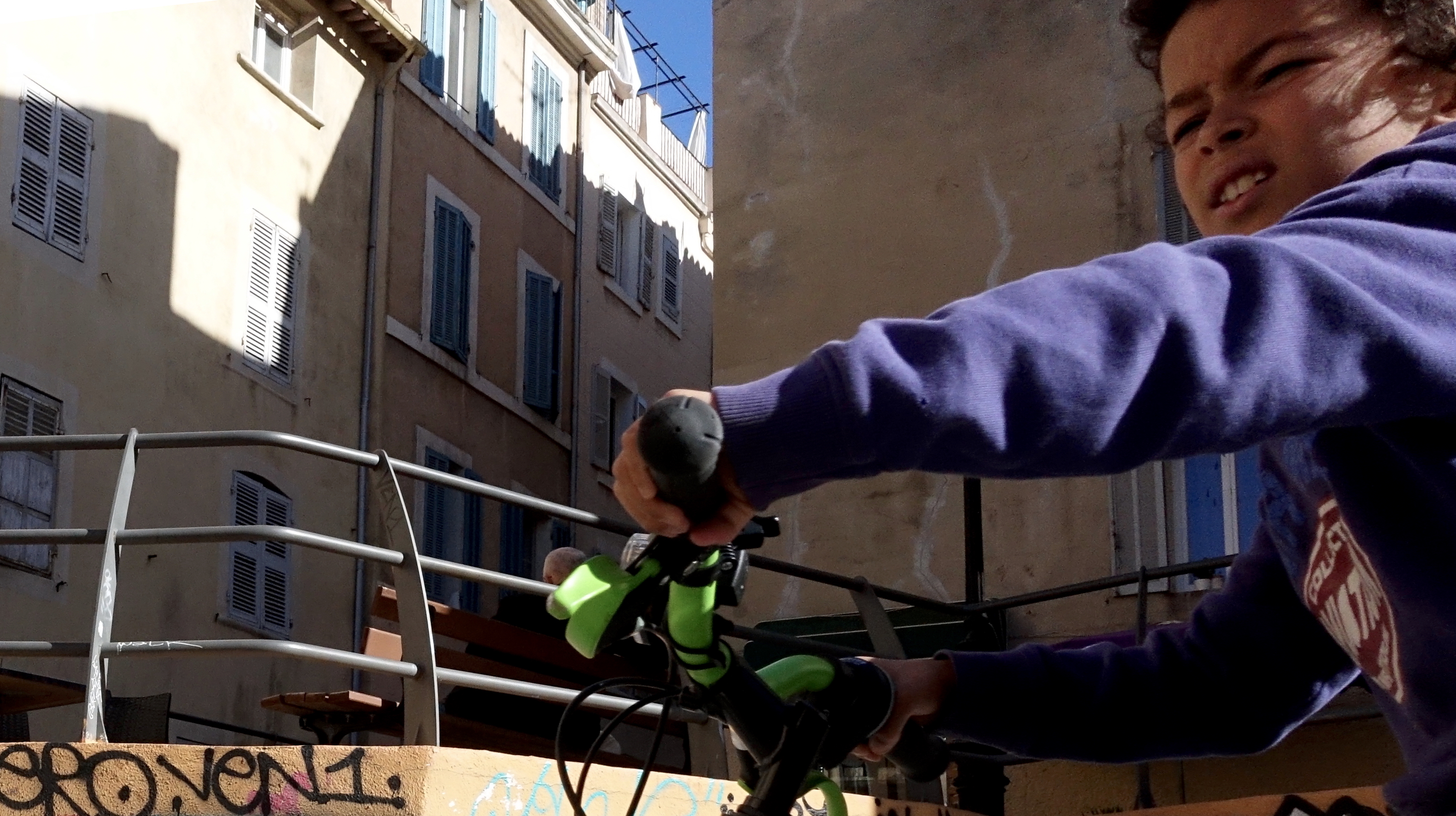 Une fin de journée de septembre tout en douceur. Au pied du Mucem, tandis que son père lézarde sur les grosses pierres de la digue, il vient de déposer son vélo pour attaquer une nouvelle activité.